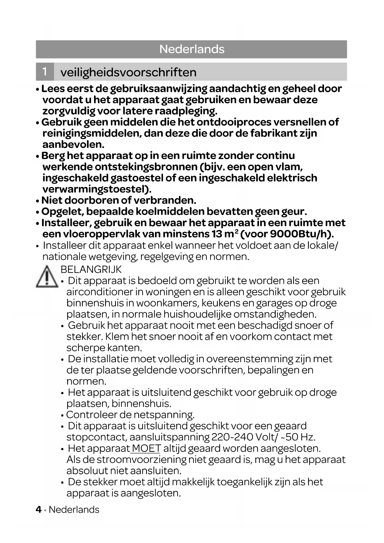 - Reparaties mogen alleen worden uitgevoerd zoals aanbevolen door de fabrikant van het apparaat. Onderhoud en reparatie die de hulp van ander opgeleid personeel vereisen, moeten worden uitgevoerd onder het toezicht van een persoon die weet hoe brandbare koelmiddelen te gebruiken.8 • Nederlands KOELMIDDEL (CE) N 842/2006: Deze airconditioner bevat het koelmiddel R290. De hoeveelheid koelmiddel is minder dan 1 kg en bevindt zich in een gesloten koelcircuit. Het koelmiddel heeft geen zonafbrekend vermogen. Het is echter een broeikasgas onder het Kyoto protocol en kan aldus bijdragen aan de globale opwarming van de aarde wanneer het in de atmosfeer vrijkomt. Alleen opgeleide technici met een gepast koelmiddelcertificaat mogen het toestel vullen of legen. Uw airconditioner dient bij een juist gebruik en een onbeschadigd koelmiddelcircuit niet te worden bijgevuld met koelmiddel. GWP: R290: 3. Specifieke informatie over apparaten die R290/R32 koelgas bevatten