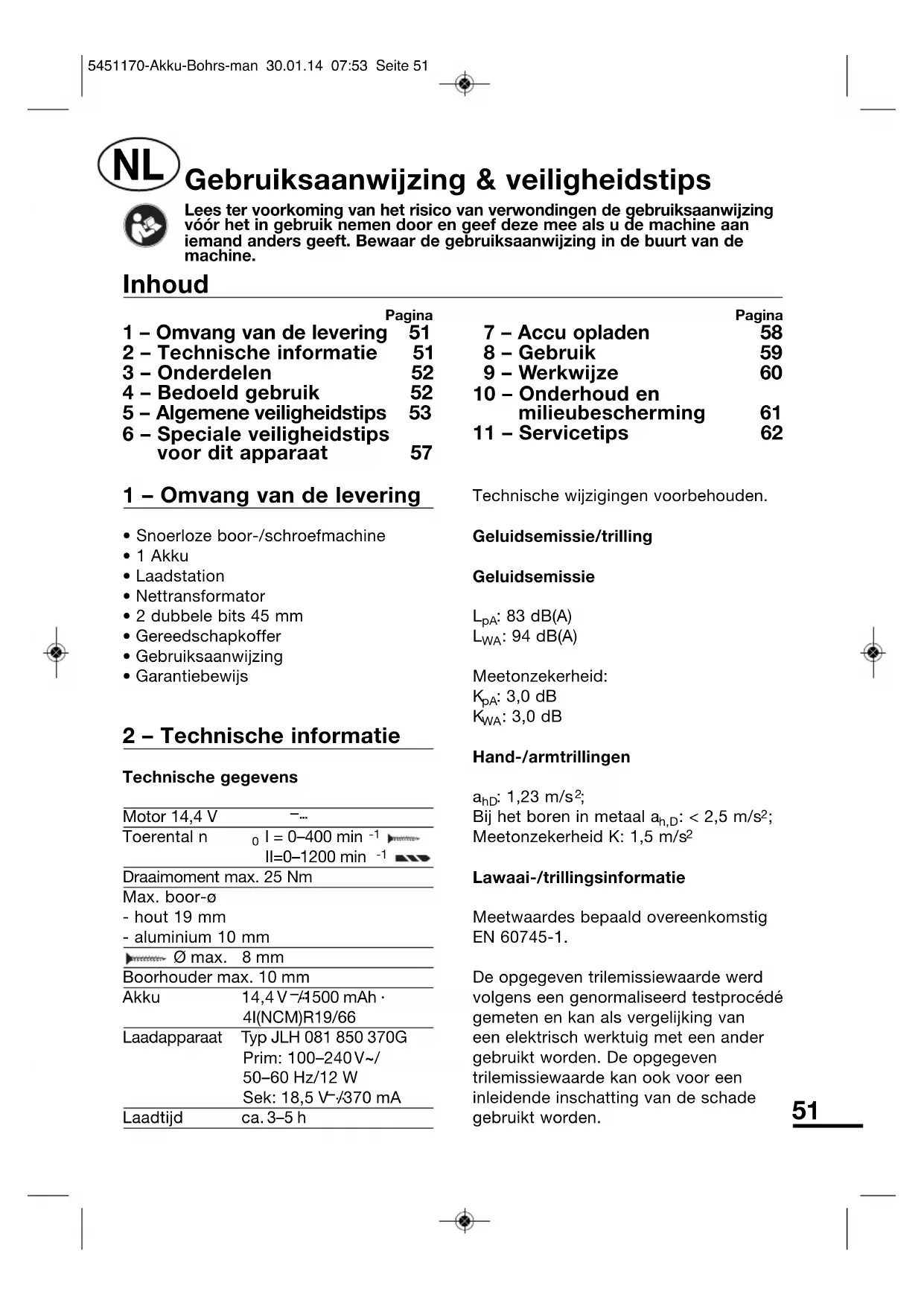 - Houd het apparaat uitsluitend vast aan de geïsoleerde greepopper - vlakken als u werkzaamheden uitvoert waarbij het inzetgereedschap verborgen stroomleidingen of de eigen stroomkabel kan raken. Contact met een stroomvoerende leiding kan ook metalen delen onder spanning zetten en een elektrische schok veroorzaken. 8 Veiligheidsinstructies voor accu/ oplaadtoestellen a Houd het oplaadtoestel op een veilige afstand van regen of nattigheid. Het binnendringen van water in een oplaadtoestel verhoogt het risico op een elektrische schok. b Laad de accu’s enkel op in oplaadtoestellen, die door de fabrikant aanbevolen worden. Voor een oplaadtoestel, dat voor een bepaald accutype geschikt is, bestaat er brandgevaar als het met andere accu’s gebruikt wordt. c Laad geen vreemde accu’s. Het oplaadtoestel is enkel voor het opladen van de bijgeleverde accu met de in de Technische Gegevens aangegeven spanningen geschikt. In het andere geval bestaat er brand- en ontploffingsgevaar. d Houd het oplaadtoestel netjes. Door vervuiling bestaat het gevaar voor een elektrische schok. 5451170-Akku-Bohrs-man 30.01.14 07:53 Seite 5657 e Controleer telkens vóór gebruik oplaadtoestel, kabel en stekker. Gebruik het oplaadtoestel niet voor zover u beschadigingen vaststelt. Open het oplaadtoestel niet zelf en laat het enkel door gekwalificeerd, geschoold personeel en uitsluitend met originele reserveonderdelen repareren. Beschadigde oplaad - toestellen, kabel en stekker verhogen het risico op een elektrische schok. f Bedien het oplaadtoestel niet op een licht ontvlambare ondergrond (bijvoorbeeld papier, textiel etc.) c.q. in een ontvlambare omgeving. Wegens de bij het opladen opduikende verwarming van het oplaadtoestel bestaat er brandgevaar. g Bij een verkeerde toepassing kan er vloeistof uit de accu vrijkomen. Vermijd het contact daarmee. Bij toevallig contact met water afspoelen. Als de vloeistof in de ogen komt, doet u aanvullend beroep op medische hulp. Vrijkomende accuvloeistof kan tot huidirritaties of brandwonden leiden. h Open de accu niet. Er bestaat gevaar voor een kortsluiting. i Bescherm de accu tegen hitte, bijvoorbeeld ook tegen aanhoudende zonnestraling, en vuur. Er bestaat ontploffingsgevaar. j De accu niet kortsluiten. Er bestaat ontploffingsgevaar. k Bij beschadiging en een onoordeelkundig gebruik van de accu’s kunnen er dampen vrijkomen. Voer frisse lucht aan en raadpleeg bij klachten een arts. De dampen kunnen de luchtwegen irriteren. 6 – Speciale veiligheidstips voor dit apparaat