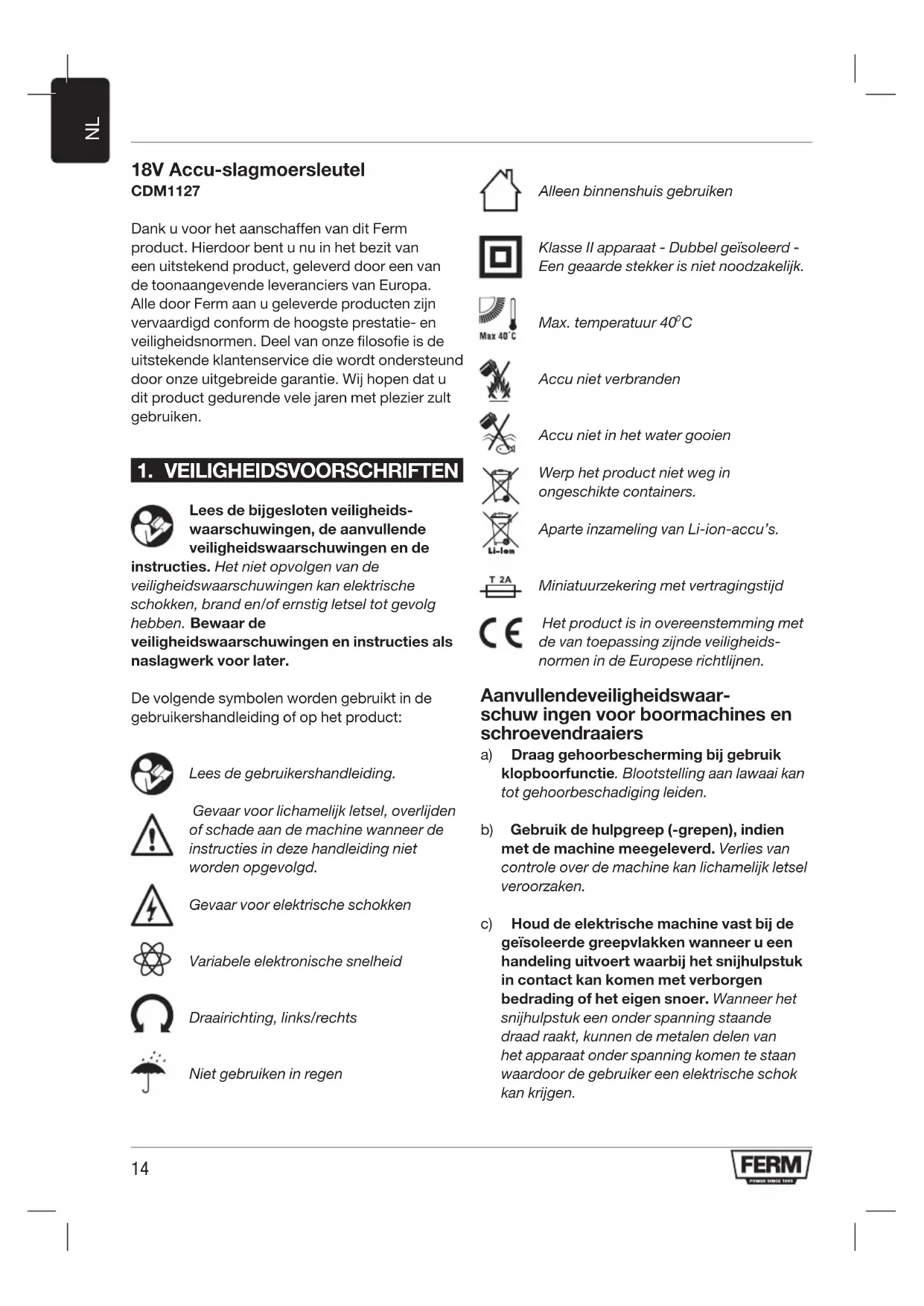 18V Accu-slagmoersleutel CDM1127 Dank u voor het aanschaffen van dit Ferm product. Hierdoor bent u nu in het bezit van een uitstekend product, geleverd door een van de toonaangevende leveranciers van Europa. Alle door Ferm aan u geleverde producten zijn vervaardigd conform de hoogste prestatie- en veiligheidsnormen. Deel van onze filosofie is de uitstekende klantenservice die wordt ondersteund door onze uitgebreide garantie. Wij hopen dat u dit product gedurende vele jaren met plezier zult gebruiken.