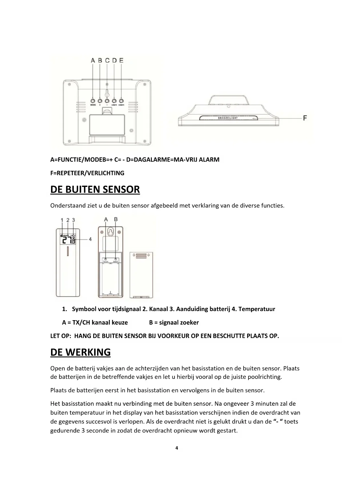 A=TX/CHkanaalkeuze B=signaalzoeker LETOP:HANGDEBUITENSENSORBIJVOORKEUROPEENBESCHUTTEPLAATSOP. DEWERKING Opendebatterijvakjesaandeachterzijdenvanhetbasisstationendebuitensensor.Plaats debatterijenindebetreffendevakjesenletuhierbijvooralopdejuistepoolrichting. Plaatsdebatterijeneerstinhetbasisstationenvervolgensindebuitensensor. Hetbasisstationmaaktnuverbindingmetdebuiten sensor.Naongeveer3minutenzalde buitentemperatuurinhetdisplayvanhetbasisstationverschijnenindiendeoverdrachtvan degegevenssuccesvolisverlopen.Alsdeoverdrachtnietisgeluktdruktudande“‐“toets gedurende3secondeinzodatdeoverdrachtopnieuwwordtgestart.5