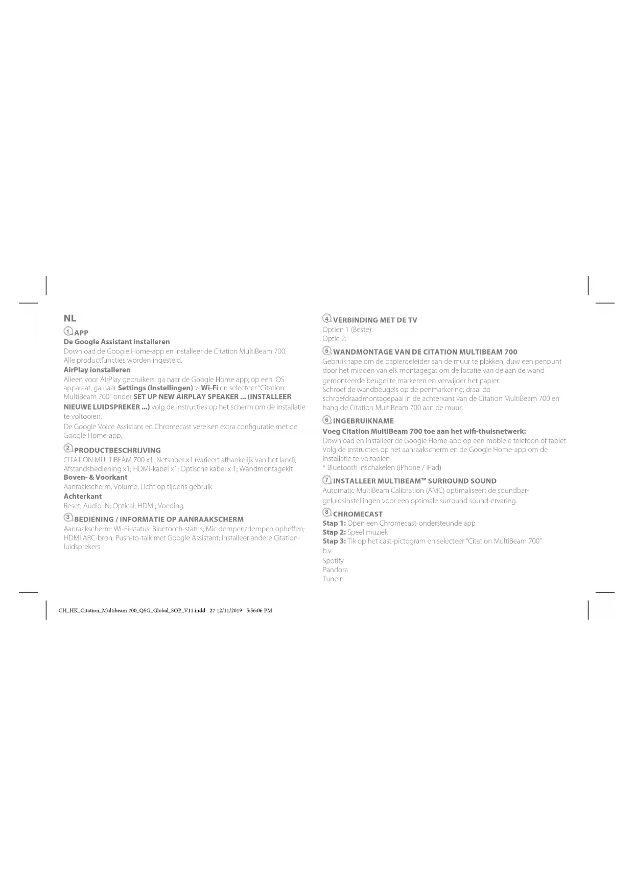 APP De Google Assistant installeren Download de Google Home-app en installeer de Citation MultiBeam 700. Alle productfuncties worden ingesteld. AirPlay ionstalleren Alleen voor AirPlay gebruikers: ga naar de Google Home app; op een iOS apparaat, ga naar Settings (Instellingen) > Wi-Fi en selecteer “Citation MultiBeam 700” onder SET UP NEW AIRPLAY SPEAKER ... (INSTALLEER NIEUWE LUIDSPREKER ...) volg de instructies op het scherm om de installatie te voltooien. De Google Voice Assistant en Chromecast vereisen extra configuratie met de Google Home-app.
