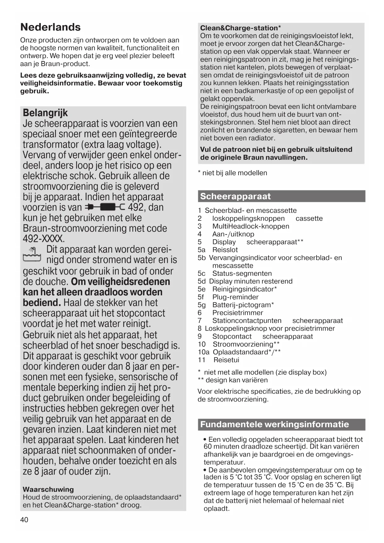 it apparaat kan worden gerei- nigd onder stromend water en is geschikt voor gebruik in bad of onder de douche. Om veiligheidsredenen kan het alleen draadloos worden bediend. Haal de stekker van het scheerapparaat uit het stopcontact voordat je het met water reinigt. Gebruik niet als het apparaat, het scheerblad of het snoer beschadigd is. Dit apparaat is geschikt voor gebruik door kinderen ouder dan 8 jaar en per- sonen met een fysieke, sensorische of mentale beperking indien zij het pro- duct gebruiken onder begeleiding of instructies hebben gekregen over het veilig gebruik van het apparaat en de gevaren inzien. Laat kinderen niet met het apparaat spelen. Laat kinderen het apparaat niet schoonmaken of onder- houden, behalve onder toezicht en als ze 8 jaar of ouder zijn. Waarschuwing Houd de stroomvoorziening, de oplaadstandaard* en het Clean&Charge-station* droog. Clean&Charge-station* Om te voorkomen dat de reinigingsvloeistof lekt, moet je ervoor zorgen dat het Clean&Charge- station op een vlak oppervlak staat. Wanneer er een reinigingspatroon in zit, mag je het reinigings- station niet kantelen, plots bewegen of verplaat- sen omdat de reinigingsvloeistof uit de patroon zou kunnen lekken. Plaats het reinigingsstation niet in een badkamerkastje of op een gepolijst of gelakt oppervlak. De reinigingspatroon bevat een licht ontvlambare vloeistof, dus houd hem uit de buurt van ont- stekingsbronnen. Stel hem niet bloot aan direct zonlicht en brandende sigaretten, en bewaar hem niet boven een radiator. Vul de patroon niet bij en gebruik uitsluitend de originele Braun navullingen.