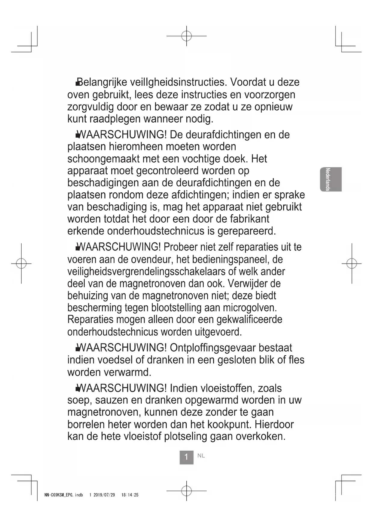 WAARSCHUWING! Indien vloeistoffen, zoals soep, sauzen en dranken opgewarmd worden in uw magnetronoven, kunnen deze zonder te gaan borrelen heter worden dan het kookpunt. Hierdoor kan de hete vloeistof plotseling gaan overkoken. NN-C69KSM_EPG.indb 1 2019/07/29 18:14:252