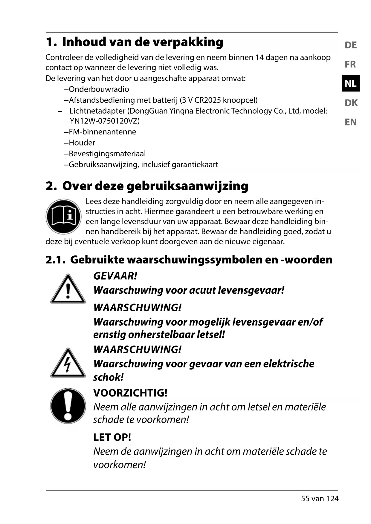 Controleer de volledigheid van de levering en neem binnen 14 dagen na aankoop contact op wanneer de levering niet volledig was. De levering van het door u aangeschafte apparaat omvat: − Onderbouwradio − Afstandsbediening met batterij (3 V CR2025 knoopcel) − Lichtnetadapter (DongGuan Yingna Electronic Technology Co., Ltd, model: YN12W-0750120VZ) − FM-binnenantenne − Houder − Bevestigingsmateriaal − Gebruiksaanwijzing, inclusief garantiekaart
