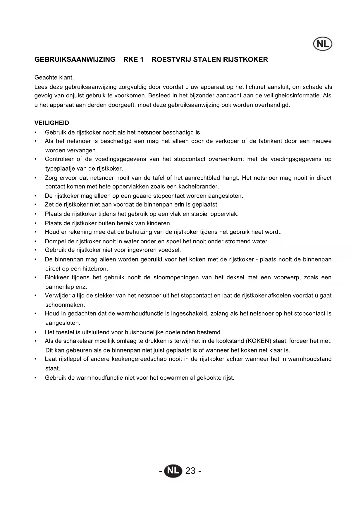 GEBRUIKSAANWIJZING RKE 1 ROESTVRIJ STALEN RIJSTKOKER