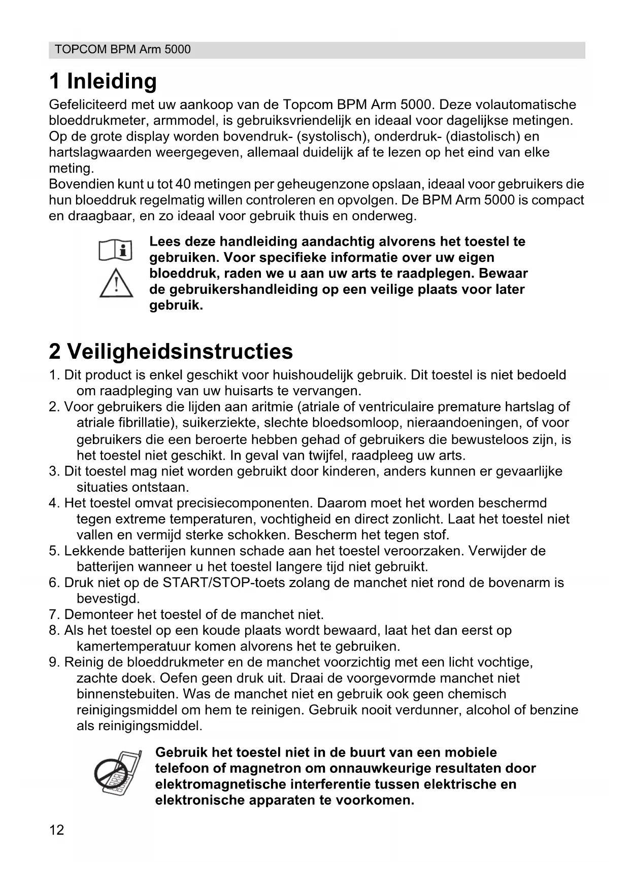 zachte doek. Oefen geen druk uit. Draai de voorgevormde manchet niet binnenstebuiten. Was de manchet niet en gebruik ook geen chemisch reinigingsmiddel om hem te reinigen. Gebruik nooit verdunner, alcohol of benzine als reinigingsmiddel. Lees deze handleiding aandachtig alvorens het toestel te gebruiken. Voor specifieke informatie over uw eigen bloeddruk, raden we u aan uw arts te raadplegen. Bewaar de gebruikershandleiding op een veilige plaats voor later gebruik. Gebruik het toestel niet in de buurt van een mobiele telefoon of magnetron om onnauwkeurige resultaten door elektromagnetische interferentie tussen elektrische en elektronische apparaten te voorkomen.13 NEDERLANDS TOPCOM BPM Arm 5000 3 Bloeddruk