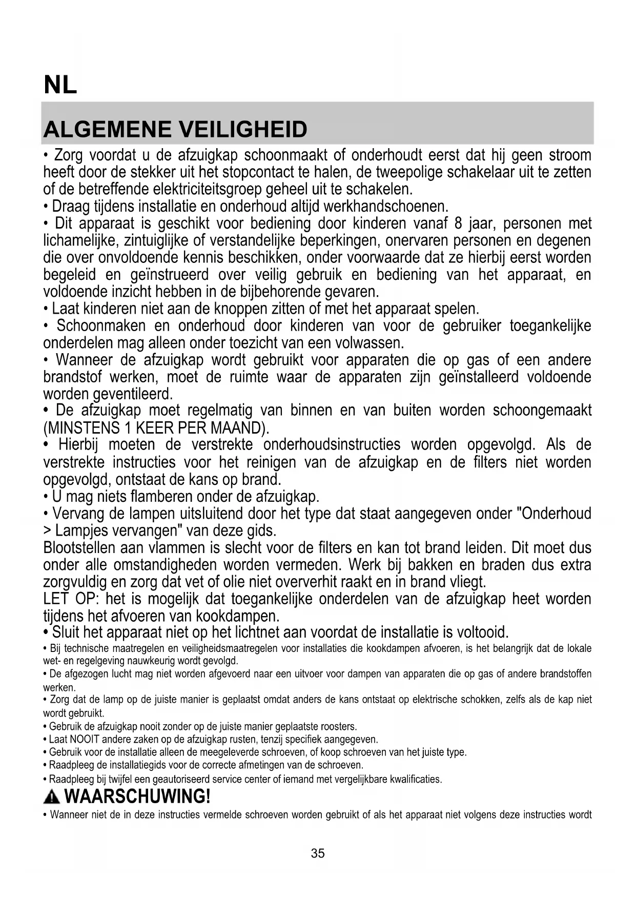 - Laat NOOIT andere zaken op de afzuigkap rusten, tenzij specifiek aangegeven.