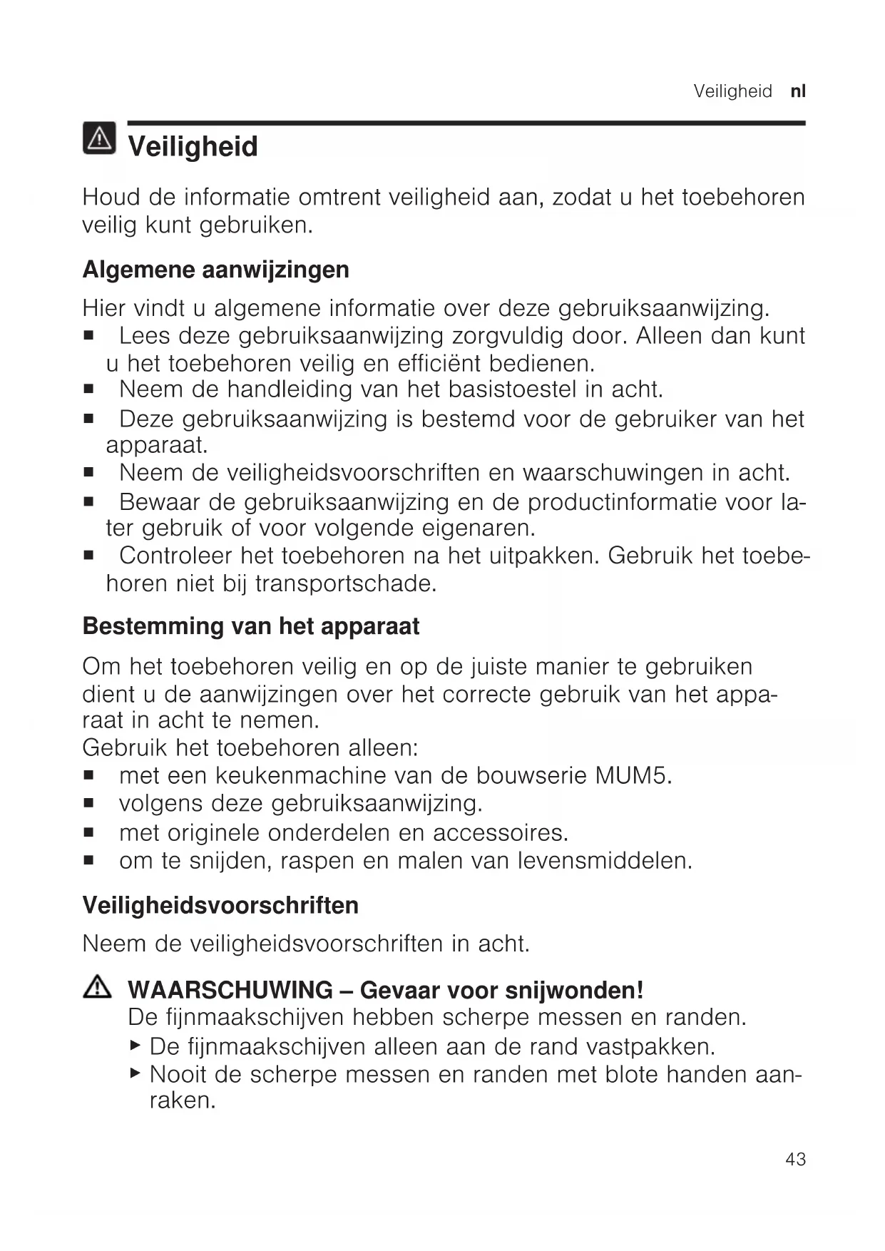 Veiligheid Houd de informatie omtrent veiligheid aan, zodat u het toebehoren veilig kunt gebruiken. Algemene aanwijzingen Hier vindt u algemene informatie over deze gebruiksaanwijzing. ¡ Lees deze gebruiksaanwijzing zorgvuldig door. Alleen dan kunt u het toebehoren veilig en efficiënt bedienen. ¡ Neem de handleiding van het basistoestel in acht. ¡ Deze gebruiksaanwijzing is bestemd voor de gebruiker van het apparaat. ¡ Neem de veiligheidsvoorschriften en waarschuwingen in acht. ¡ Bewaar de gebruiksaanwijzing en de productinformatie voor la- ter gebruik of voor volgende eigenaren. ¡ Controleer het toebehoren na het uitpakken. Gebruik het toebe- horen niet bij transportschade. Bestemming van het apparaat Om het toebehoren veilig en op de juiste manier te gebruiken dient u de aanwijzingen over het correcte gebruik van het appa- raat in acht te nemen. Gebruik het toebehoren alleen: ¡ met een keukenmachine van de bouwserie MUM5. ¡ volgens deze gebruiksaanwijzing. ¡ met originele onderdelen en accessoires. ¡ om te snijden, raspen en malen van levensmiddelen. Veiligheidsvoorschriften Neem de veiligheidsvoorschriften in acht. WAARSCHUWING‒Gevaar voor snijwonden! De fijnmaakschijven hebben scherpe messen en randen.