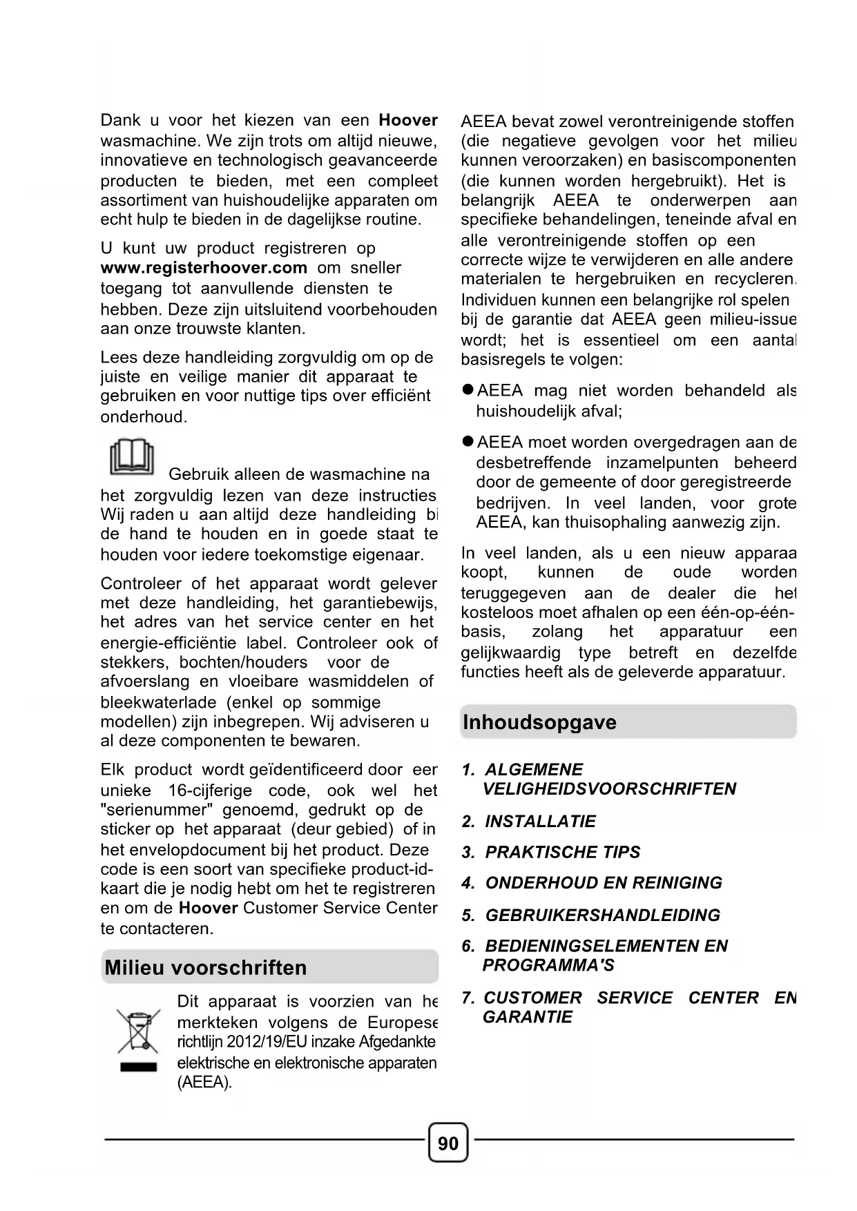 U kunt uw product registreren op www.registerhoover.com om sneller toegang tot aanvullende diensten te hebben. Deze zijn uitsluitend voorbehouden aan onze trouwste klanten. Lees deze handleiding zorgvuldig om op de juiste en veilige manier dit apparaat te gebruiken en voor nuttige tips over efficiënt onderhoud. Gebruik alleen de wasmachine na het zorgvuldig lezen van deze instructies. Wij raden u aan altijd deze handleiding bij de hand te houden en in goede staat te houden voor iedere toekomstige eigenaar. Controleer of het apparaat wordt geleverd met deze handleiding, het garantiebewijs, het adres van het service center en het energie-efficiëntie label. Controleer ook of stekkers, bochten/houders voor de afvoerslang en vloeibare wasmiddelen of bleekwaterlade (enkel op sommige modellen) zijn inbegrepen. Wij adviseren u al deze componenten te bewaren. Elk product wordt geïdentificeerd door een unieke 16-cijferige code, ook wel het "serienummer" genoemd, gedrukt op de sticker op het apparaat (deur gebied) of in het envelopdocument bij het product. Deze code is een soort van specifieke product-id- kaart die je nodig hebt om het te registreren en om de Hoover Customer Service Center te contacteren.