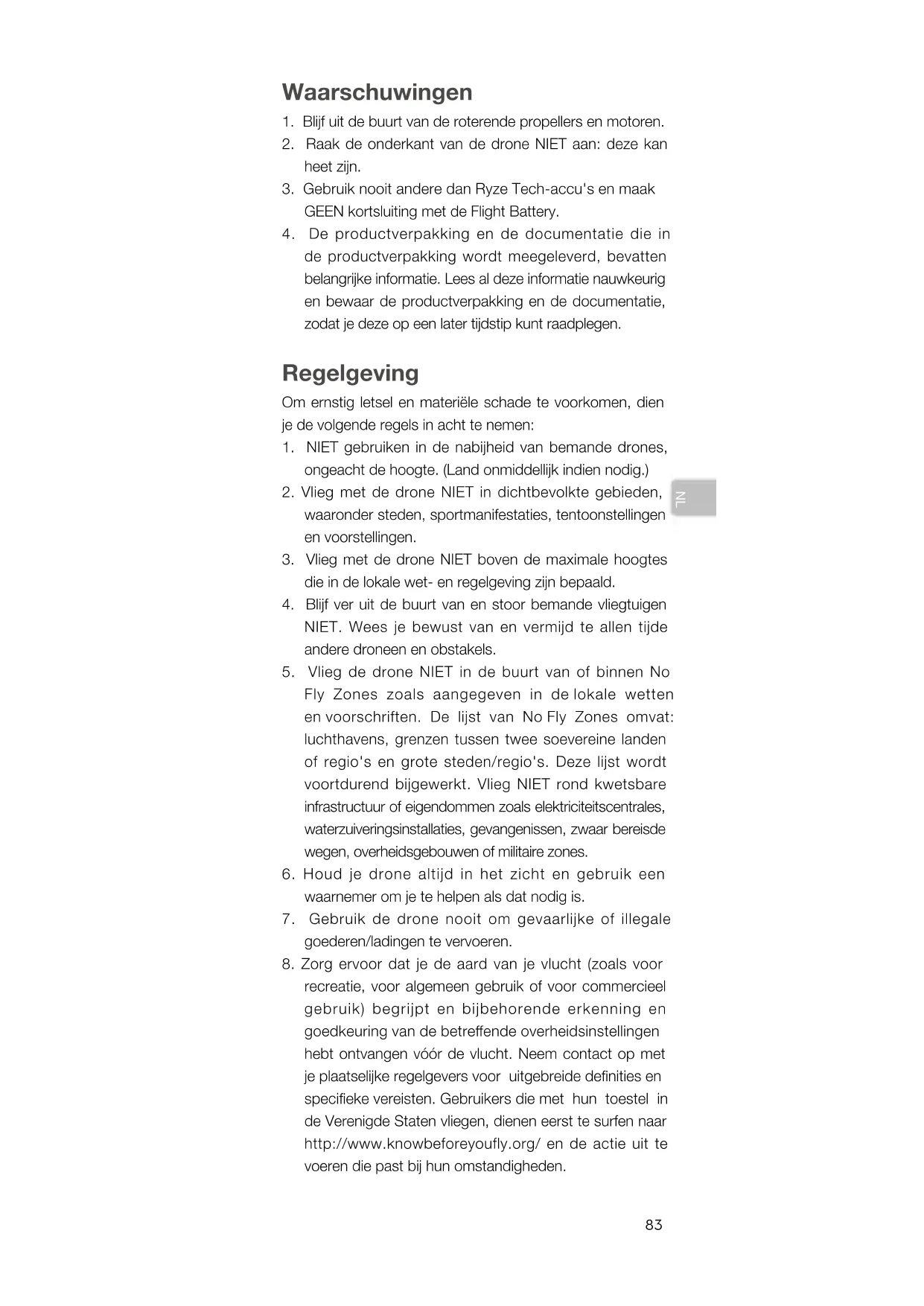 VERSCHILLEN. Ryze Tech aanvaardt geen aansprakelijkheid voor schade, letsel of enige wettelijke verantwoordelijkheid die direct of indirect voortkomt uit het gebruik van dit product. De gebruiker neemt veilig en legaal gebruik in acht, inclusief, maar niet beperkt tot wat in deze veiligheidsvoorschriften uiteen is gezet. Je bent zelf verantwoordelijk voor je eigen gedrag wanneer je met een Tello-drone vliegt.83