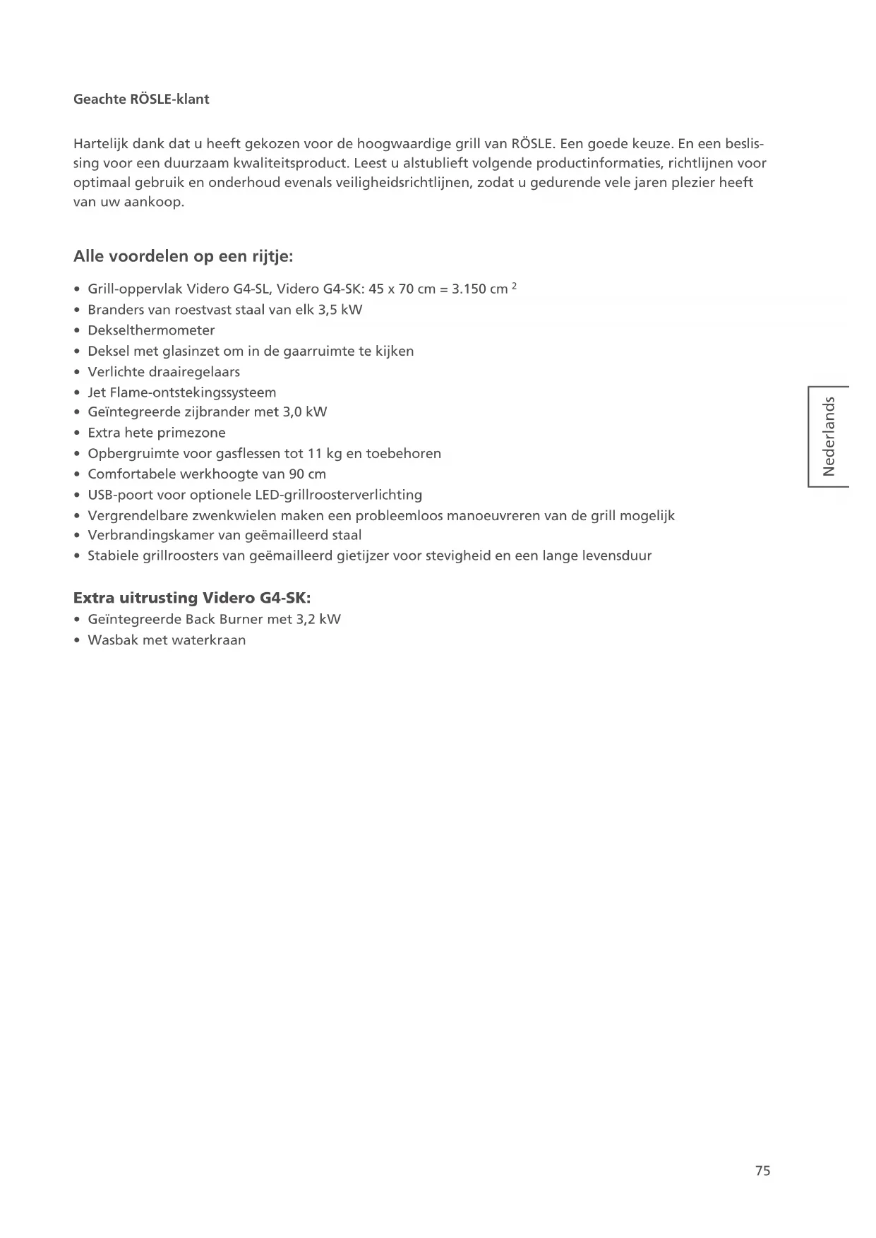 - Toebehoren Nederlands Geachte RÖSLE-klant Hartelijk dank dat u heeft gekozen voor de hoogwaardige grill van RÖSLE. Een goede keuze. En een beslis- sing voor een duurzaam kwaliteitsproduct. Leest u alstublieft volgende productinformaties, richtlijnen voor optimaal gebruik en onderhoud evenals veiligheidsrichtlijnen, zodat u gedurende vele jaren plezier heeft van uw aankoop. Alle voordelen op een rijtje: p. 9775