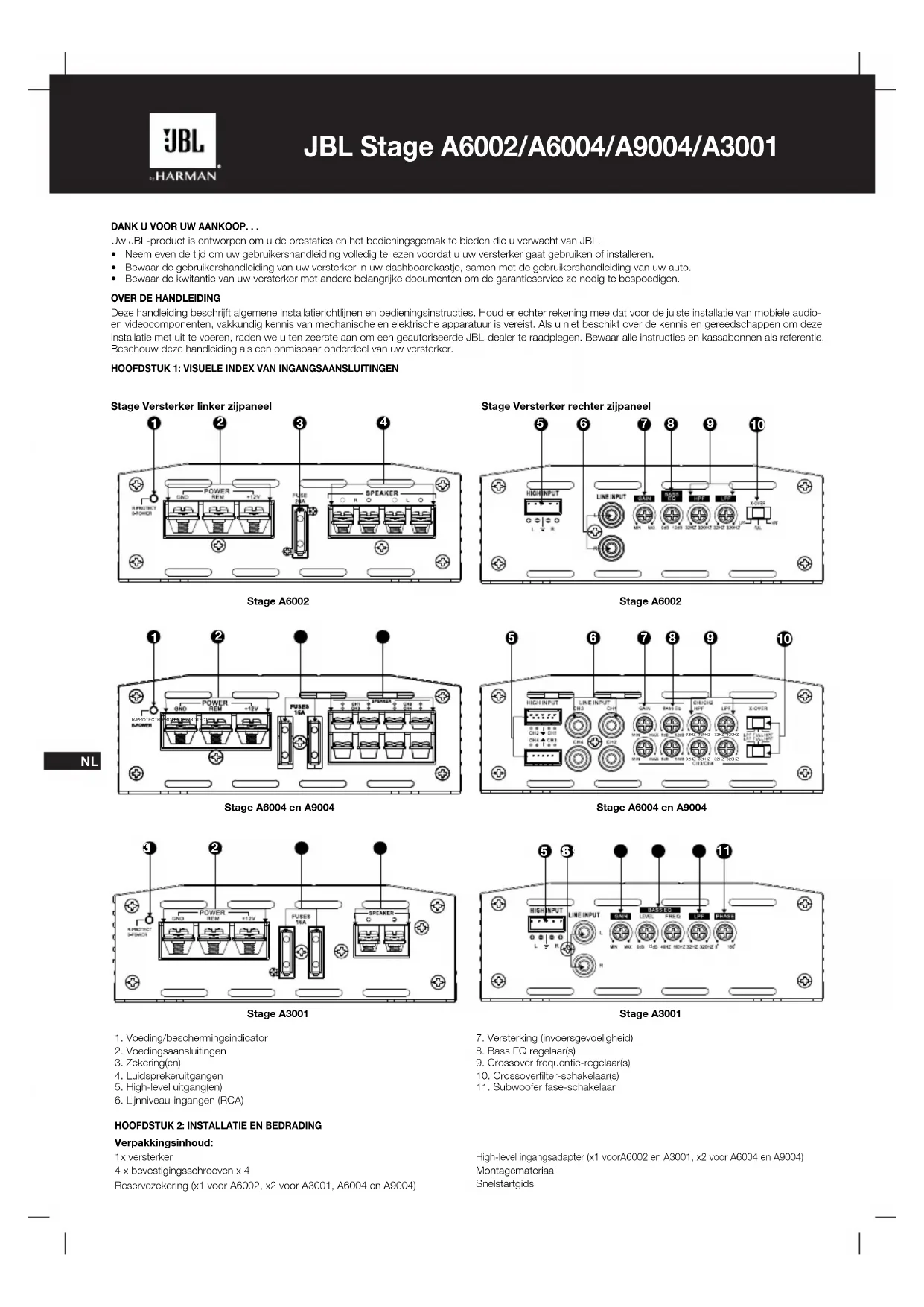 Deze handleiding beschrijft algemene installatierichtlijnen en bedieningsinstructies. Houd er echter rekening mee dat voor de juiste installatie van mobiele audio- en videocomponenten, vakkundig kennis van mechanische en elektrische apparatuur is vereist. Als u niet beschikt over de kennis en gereedschappen om deze installatie met uit te voeren, raden we u ten zeerste aan om een geautoriseerde JBL-dealer te raadplegen. Bewaar alle instructies en kassabonnen als referentie. Beschouw deze handleiding als een onmisbaar onderdeel van uw versterker. HOOFDSTUK 1: VISUELE INDEX VAN INGANGSAANSLUITINGENStage Versterker linker zijpaneelStage A6002 Stage A6004 en A9004 Stage A6004 en A9004 Stage A3001Stage A6002Stage A30011. Voeding/beschermingsindicator2. Voedingsaansluitingen3. Zekering(en)4. Luidsprekeruitgangen5. High-level uitgang(en)6. Lijnniveau-ingangen (RCA)7. Versterking (invoersgevoeligheid)8. Bass EQ regelaar(s)9. Crossover frequentie-regelaar(s)10. Crossoverfilter-schakelaar(s)11. Subwoofer fase-schakelaarStage Versterker rechter zijpaneel