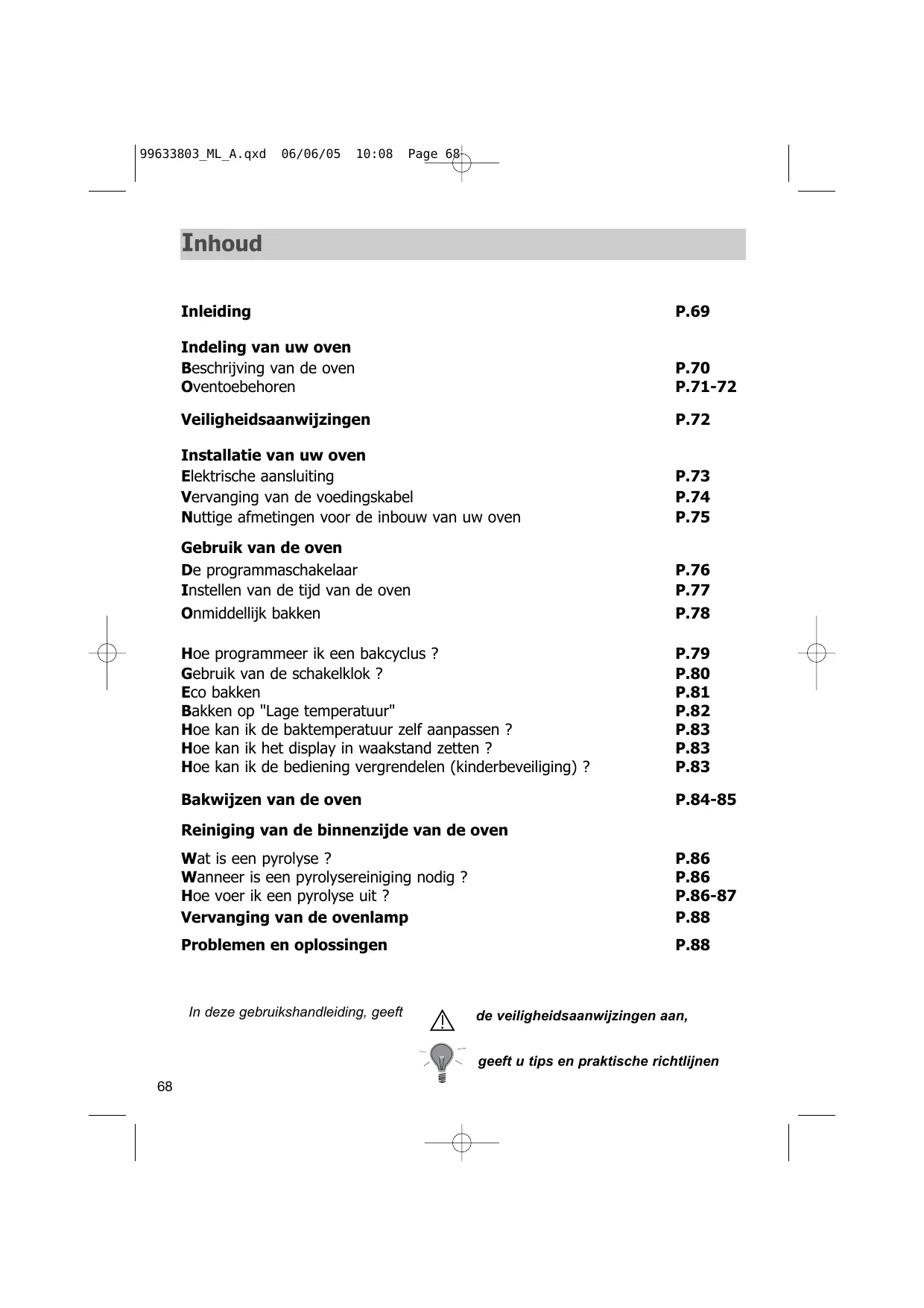 99633803_ML_A.qxd 06/06/05 10:08 Page 68 Inhoud Inleiding P.69 Indeling van uw oven Beschrijving van de oven Oventoebehoren P.70 P.71-72 Veiligheidsaanwijzingen P.72 Installatie van uw oven Elektrische aansluiting Vervanging van de voedingskabel Nuttige afmetingen voor de inbouw van uw oven P.73 P.74 P.75 Gebruik van de oven De programmaschakelaar Instellen van de tijd van de oven P.76 P.77 Onmiddellijk bakken P.78 Hoe programmeer ik een bakcyclus ? Gebruik van de schakelklok ? Eco bakken Bakken op "Lage temperatuur" Hoe kan ik de baktemperatuur zelf aanpassen ? Hoe kan ik het display in waakstand zetten ? Hoe kan ik de bediening vergrendelen (kinderbeveiliging) ? P.79 P.80 P.81 P.82 P.83 P.83 P.83 Bakwijzen van de oven P.84-85 Reiniging van de binnenzijde van de oven Wat is een pyrolyse ? Wanneer is een pyrolysereiniging nodig ? Hoe voer ik een pyrolyse uit ? Vervanging van de ovenlamp P.86 P.86 P.86-87 P.88 Problemen en oplossingen P.88 In deze gebruikshandleiding, geeft de veiligheidsaanwijzingen aan, geeft u tips en praktische richtlijnen