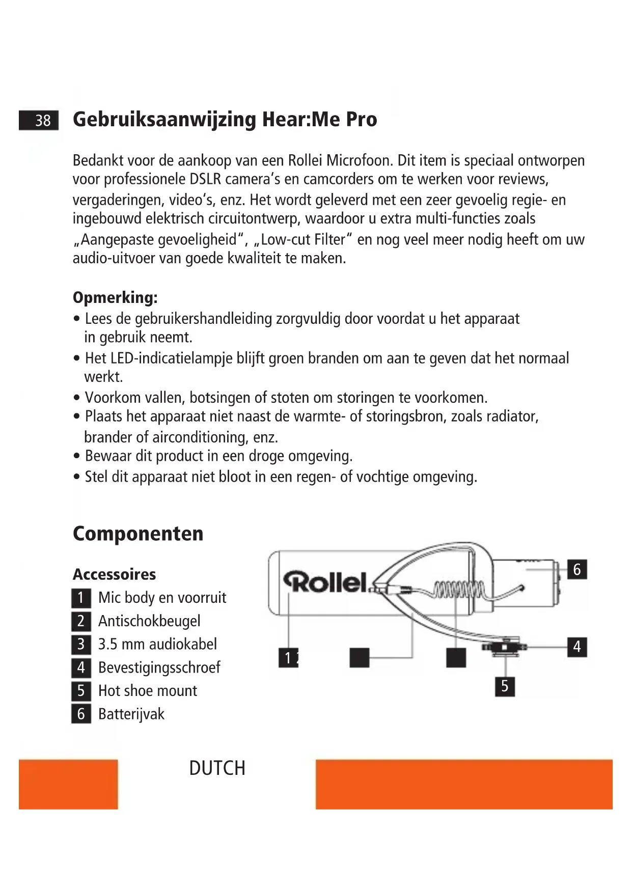 - Stel dit apparaat niet bloot in een regen- of vochtige omgeving. Componenten Accessoires Mic body en voorruit Antischokbeugel