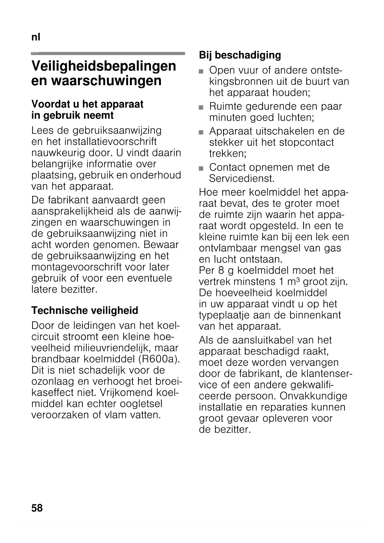 nlInhoud nlGebruiksaanwijzing Veiligheidsbepalingen en waarschuwingen Voordat u het apparaat in gebruik neemt Lees de gebruiksaanwijzing en het installatievoorschrift nauwkeurig door. U vindt daarin belangrijke informatie over plaatsing, gebruik en onderhoud van het apparaat. De fabrikant aanvaardt geen aansprakelijkheid als de aanwij- zingen en waarschuwingen in de gebruiksaanwijzing niet in acht worden genomen. Bewaar de gebruiksaanwijzing en het montagevoorschrift voor later gebruik of voor een eventuele latere bezitter. Technische veiligheid Door de leidingen van het koel- circuit stroomt een kleine hoe- veelheid milieuvriendelijk, maar brandbaar koelmiddel (R600a). Dit is niet schadelijk voor de ozonlaag en verhoogt het broei- kaseffect niet. Vrijkomend koel- middel kan echter oogletsel veroorzaken of vlam vatten. Bij beschadiging ■ Open vuur of andere ontste- kingsbronnen uit de buurt van het apparaat houden; ■ Ruimte gedurende een paar minuten goed luchten; ■ Apparaat uitschakelen en de stekker uit het stopcontact trekken; ■ Contact opnemen met de Servicedienst. Hoe meer koelmiddel het appa- raat bevat, des te groter moet de ruimte zijn waarin het appa- raat wordt opgesteld. In een te kleine ruimte kan bij een lek een ontvlambaar mengsel van gas en lucht ontstaan. Per 8 g koelmiddel moet het vertrek minstens 1 m³ groot zijn. De hoeveelheid koelmiddel in uw apparaat vindt u op het typeplaatje aan de binnenkant van het apparaat. Als de aansluitkabel van het apparaat beschadigd raakt, moet deze worden vervangen door de fabrikant, de klantenser- vice of een andere gekwalifi- ceerde persoon. Onvakkundige installatie en reparaties kunnen groot gevaar opleveren voor de bezitter.nl