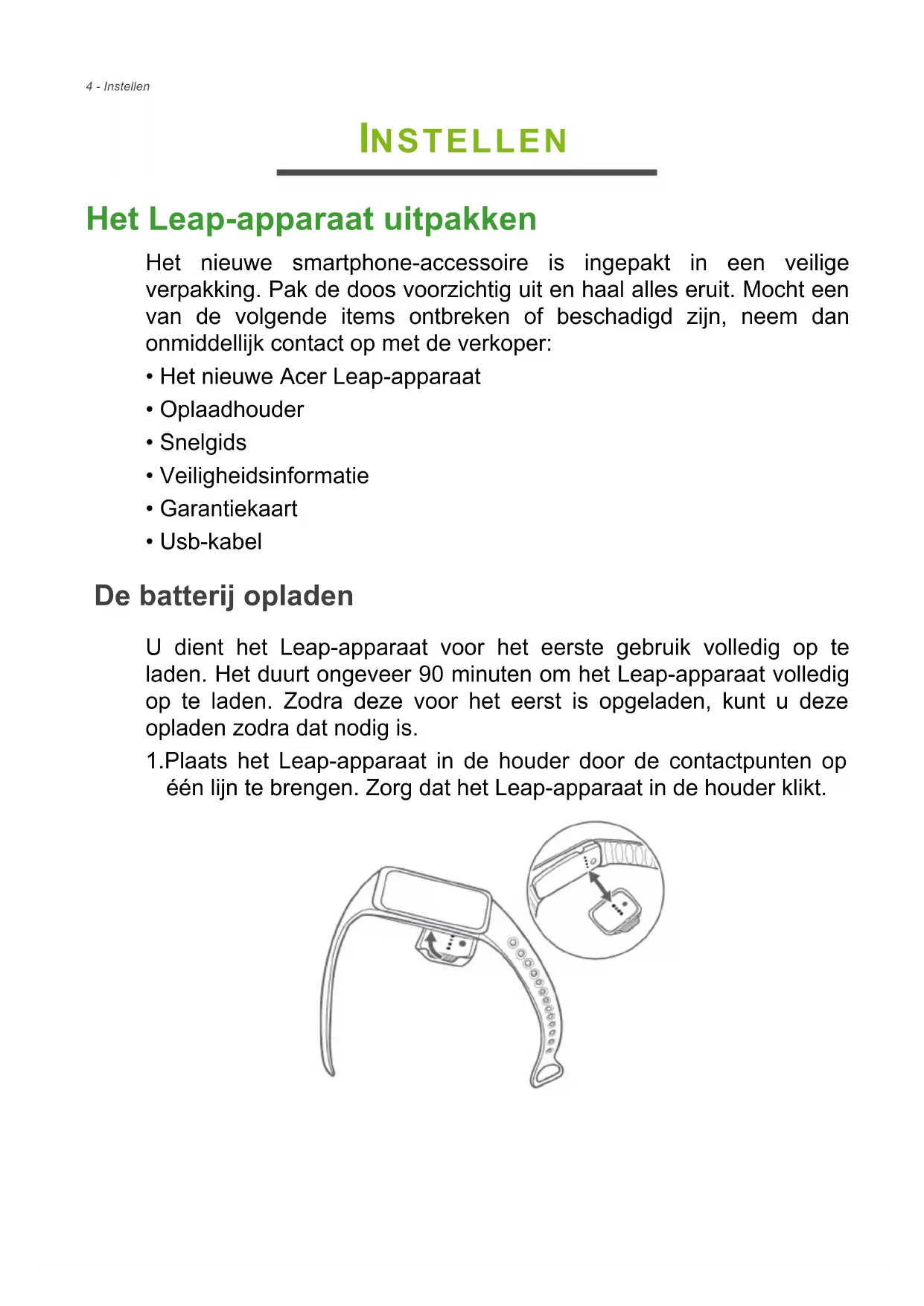 - Usb-kabel De batterij opladen U dient het Leap-apparaat voor het eerste gebruik volledig op te laden. Het duurt ongeveer 90 minuten om het Leap-apparaat volledig op te laden. Zodra deze voor het eerst is opgeladen, kunt u deze opladen zodra dat nodig is. 1.Plaats het Leap-apparaat in de houder door de contactpunten op één lijn te brengen. Zorg dat het Leap-apparaat in de houder klikt.Instellen - 5 2.U kunt de houder op een computer aansluiten met de bijgesloten usb-kabel. 3.Laad het Leap-apparaat ongeveer 90 minuten om het volledig op te laden. De voortgang van het opladen ziet u op het scherm. Opmerking Tik tweemaal het scherm om het accuniveau te zien.6 - Instellen De polsband bevestigen 1.Bevestig de polsband zoals in de afbeelding is geïllustreerd. 2.Voer het ene uiteinde van de riem door de lus aan het andere uiteinde van de riem. Richt beide uiteinden van de polsband zodat ze elkaar direct overlappen, met de klem op de twee gaten die het beste zitten. 3.Druk met duim en wijsvinger op zowel de klem als de polsband totdat de polsband goed vast zit.Instellen - 7 U merkt dat de polsband van het Leap-apparaat goed vast zit als beide haken van de klem volledig in de polsband zijn geplaatst. De band vervangen U kunt de band vervangen, wanneer u dat wenst. Druk het centrale gedeelte van de Liquid Leap Active voorzichtig uit de band en plaats deze in de nieuwe band; zorg ervoor dat deze correct geplaatst is.8 - Instellen Onderhoud en tips voor het dragen Denk aan de volgende tips als u het Leap-apparaat reinigt: