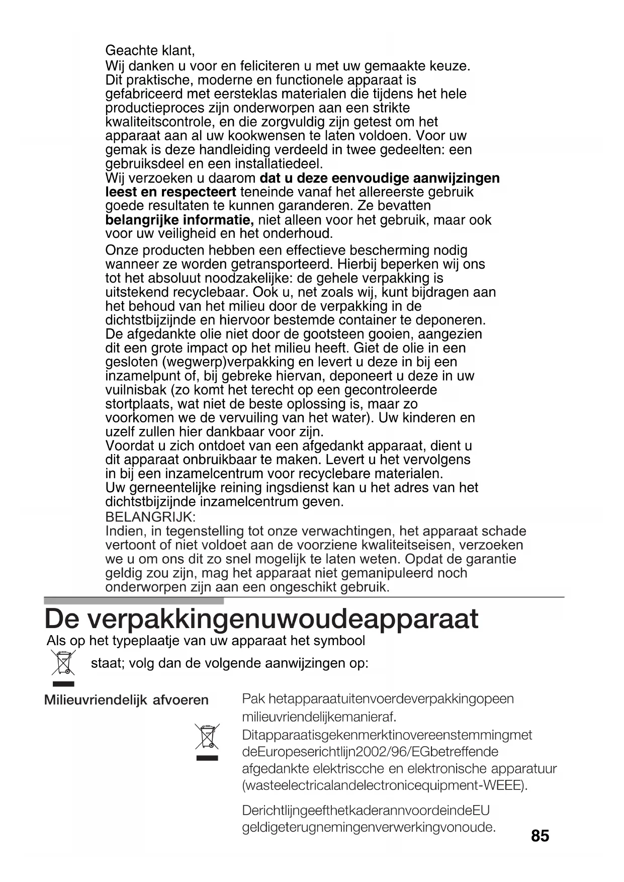 ...se a ignição eléctrica não funciona? ...se a chama dos queimadores não for uniforme? ...se o fluxo de gás não parece normal, ou não sair gás? ...se houver cheiro a gás no recinto da cozinha? ... se não funcionam as seguranças dos diferentes queimadores? - Fusível defeituoso. - O disjuntor ou um diferencial da instalação pode ter saltado. - Pode haver resíduos de alimentos ou de limpeza entre a vela e os queimadores. - Os queimadores estão molhados. - As tampas do queimador estão mal colocadas. - As diversas partes do queimador foram mal colocadas. - As ranhuras de saída do gás dos queimadores estão sujas. - A passagem de gás está fechada por causa de torneiras intermédias. - Se o gás for proveniente de uma bilha, é possível que esta esteja vazia. - Alguma torneira está aberta. - Possível fuga no acoplamento à bilha. - Controle o fusível na caixa geral dos fusíveis e substitua-o se estiver avariado. - Verifique na caixa geral de entrada se saltou o disjuntor ou um dos diferenciais. - O espaço entre a vela e os queimadores deve ser limpo com muito cuidado - Seque cuidadosamente as tampas do queimador e as velas. - Verifique que as tampas foram bem colocadas. - Coloque as várias ordem correcta. - Limpe as ranhuras - Abra as eventuais - Substitua a bilha por outra cheia. - Proceda à sua verificação. - Certifique que o em boas condições. - Não se manteve o comando suficientemente premido. - As ranhuras de saída do gás dos queimadores estão sujas. - Depois do queimador estar aceso, mantenha o - Limpe as ranhuras de saída do gás dos queimadores. ..se o funcionamento eléctrico geral está avariado? peças diferentes na de saída do gás dos queimadores. torneiras intermédias. acoplamento está comando premido durante alguns segundos mais.84 Se telefonar para o nosso Serviço Técnico, pedimos o favor de indicar: E - NR FD Estas indicações encontram-se na placa de características do seu aparelho, situada na parte inferior da sua placa de cozedura. Condições de garantia As condições de garantia aplicáveis a este aparelho são as estabelecidas pela representação da nossa empresa no país onde tenha sido efectuada a compra. Se quiser, o vendedor ao qual se tenha comprado o aparelho estará disposto a dar-lhe em qualquer momento mais pormenores a este respeito. Em qualquer caso, para ter direito à garantia, será necessário apresentar o talão de compra. Reservado o direito de efectuar modificações.Geachte klant, Wij danken u voor en feliciteren u met uw gemaakte keuze. Dit praktische, moderne en functionele apparaat is gefabriceerd met eersteklas materialen die tijdens het hele productieproces zijn onderworpen aan een strikte kwaliteitscontrole, en die zorgvuldig zijn getest om het apparaat aan al uw kookwensen te laten voldoen. Voor uw gemak is deze handleiding verdeeld in twee gedeelten: een gebruiksdeel en een installatiedeel. Wij verzoeken u daarom dat u deze eenvoudige aanwijzingen leest en respecteert teneinde vanaf het allereerste gebruik goede resultaten te kunnen garanderen. Ze bevatten belangrijke informatie, niet alleen voor het gebruik, maar ook voor uw veiligheid en het onderhoud. Onze producten hebben een effectieve bescherming nodig wanneer ze worden getransporteerd. Hierbij beperken wij ons tot het absoluut noodzakelijke: de gehele verpakking is uitstekend recyclebaar. Ook u, net zoals wij, kunt bijdragen aan het behoud van het milieu door de verpakking in de dichtstbijzijnde en hiervoor bestemde container te deponeren. De afgedankte olie niet door de gootsteen gooien, aangezien dit een grote impact op het milieu heeft. Giet de olie in een gesloten (wegwerp)verpakking en levert u deze in bij een inzamelpunt of, bij gebreke hiervan, deponeert u deze in uw vuilnisbak (zo komt het terecht op een gecontroleerde stortplaats, wat niet de beste oplossing is, maar zo voorkomen we de vervuiling van het water). Uw kinderen en uzelf zullen hier dankbaar voor zijn. Voordat u zich ontdoet van een afgedankt apparaat, dient u dit apparaat onbruikbaar te maken. Levert u het vervolgens in bij een inzamelcentrum voor recyclebare materialen. Uw gerneentelijke reining ingsdienst kan u het adres van het dichtstbijzijnde inzamelcentrum geven.