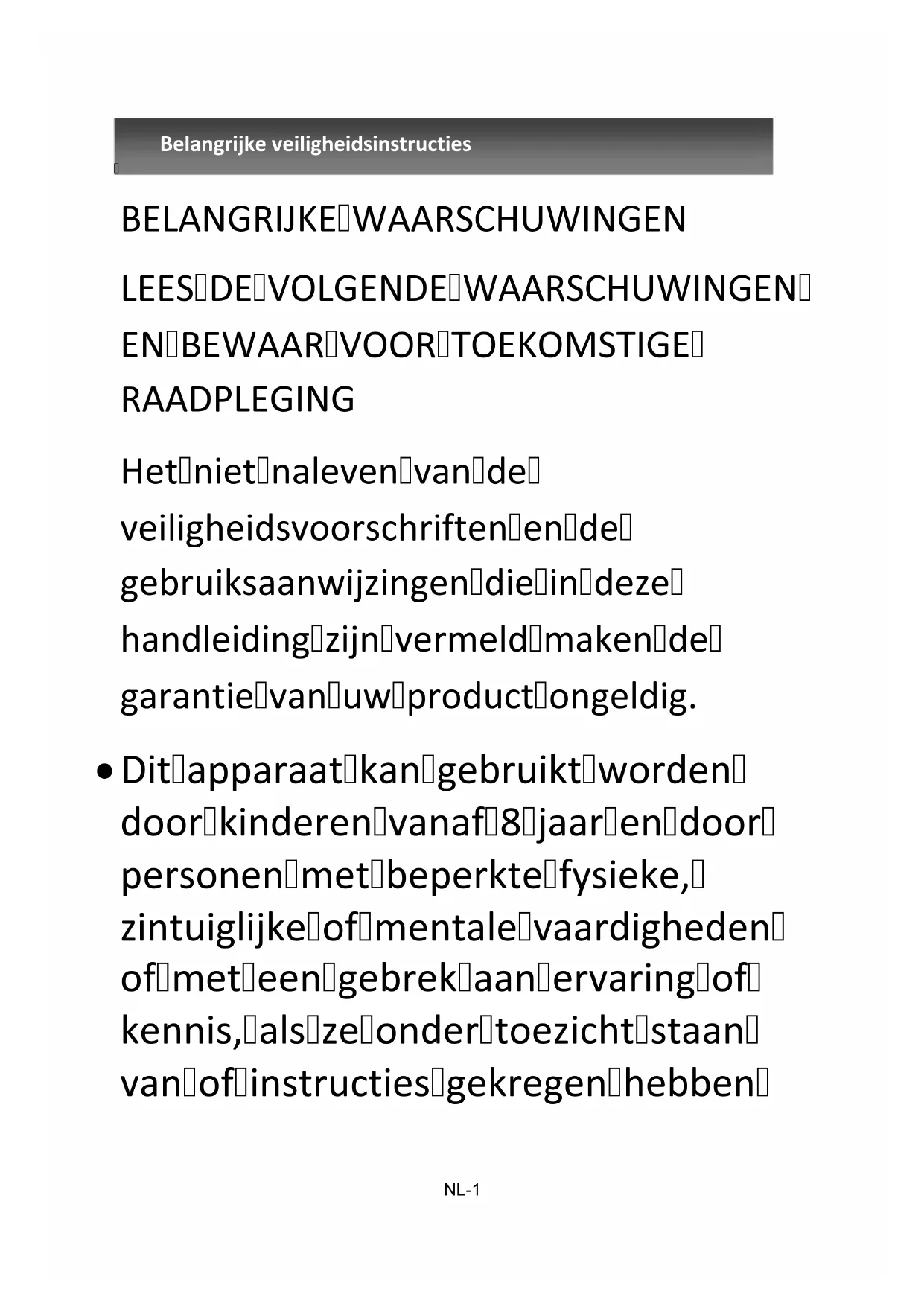 NL-1inzakehetcorrectenveiliggebruik vanhetapparaatendedaarmee gepaardgaanderisico’sbegrijpen. x Kinderendienennietmethet apparaattespelen. x Kinderenjongerdan8jaarenzonder toezichtmogenhetapparaatniet reinigenofonderhouden. x Houdhetapparaatendestekker altijduitdebuurt vankinderenjonger dan8jaar. x Hetapparaatisnietbestemdvoor gebruikmeteenexternetimerofeen NL-2 afzonderlijkopafstandbestuurd systeem. x Plaatshetapparaatnietinde nabijheidvanofopeengasfornuisof eenkookplaat,plaatshetapparaat nietopeenovenofminiͲoven.x Demicrogolfovendientnietineen meubelgeplaatstteworden. x OPGELET:deovenmagnietgebruikt wordenalsdedeurofde deurafdichtingenbeschadigdis/zijn.Laat dezeherstellendooreenbevoegd persoon.ʳ x OPGELET:uitveiligheidsoverwegingen dientelkeonderhoudsbeurtofreparatie, waarbijhetonderdeeldatbescherming biedttegenmicrogolfenergiemoet verwijderdworden,uitsluitendte NL-3 gebeurendooreennaarbehoren bevoegdpersoon.ʳ x OPGELET:vloeistoffenenandere voedingsmiddelenmogenniet opgewarmdwordeningeslotenhouders, dezekunnenontploffen.ʳ x Gebruikalleenhoudersdie microgolfbestendigzijn.ʳx Materiaalinpapierofkartonkanvuur vatten,blijfnaastdeovenstaanomdit inhetoogtehouden.ʳ x Vloeistoffendieopgewarmdwerdenin demicrogolfovenkunnenplotskoken als dezeuitdeovenwordengehaald. NL-4 Weesvoorzichtigalsudehouders aanraakt.ʳ x Omgevaaropbrandwondente vermijdenmengofschudzuigflessenen potjesmetbabyvoedingnaopwarming indemicrogolfoven.Controleerde temperatuurvandeinhoudvóór verbruik. x Deovenmoetregelmatig schoongemaaktwordenenalle voedselrestendienensystematisch verwijderdteworden.ʳ