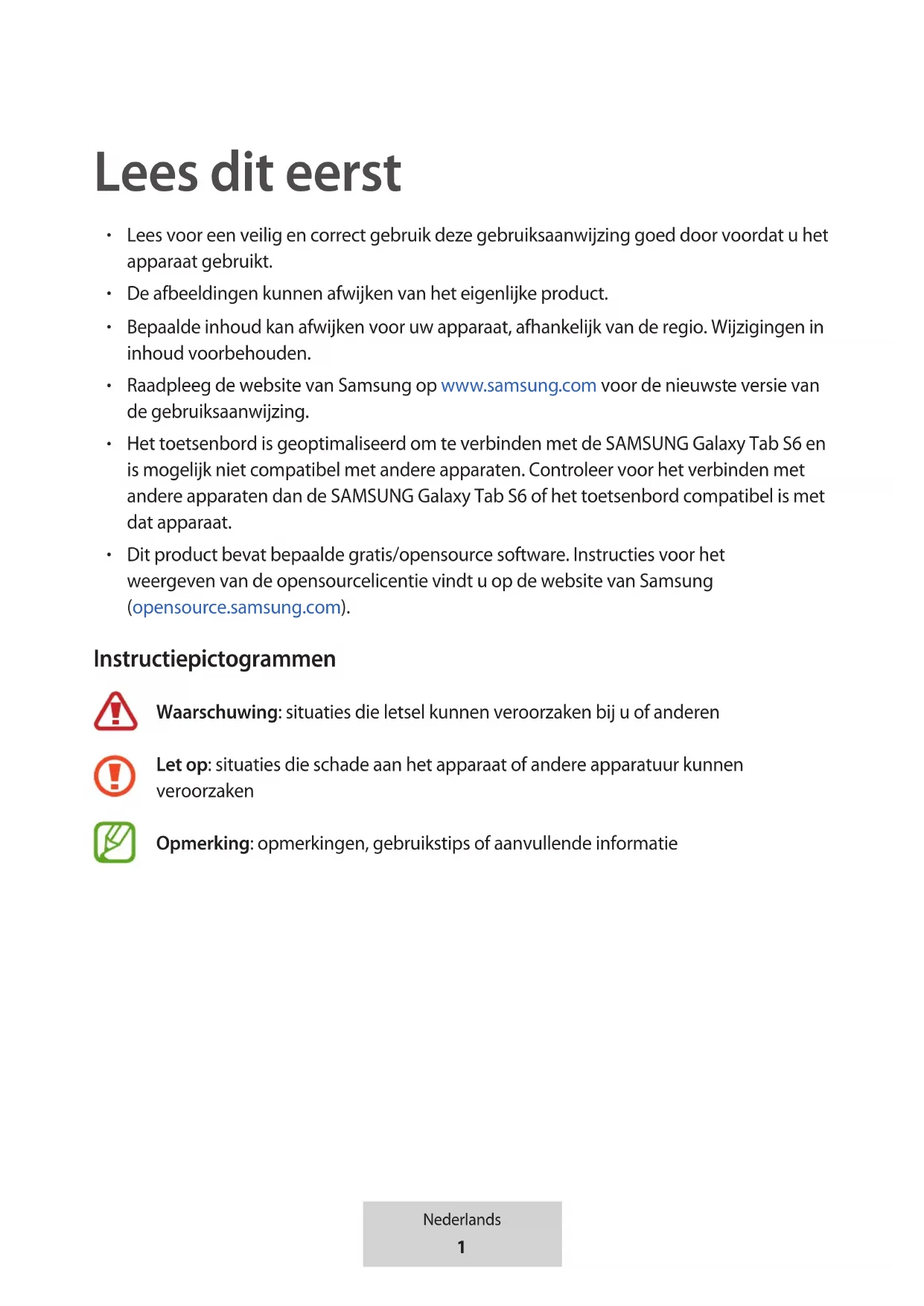 Dit product bevat bepaalde gratis/opensource software. Instructies voor het weergeven van de opensourcelicentie vindt u op de website van Samsung (opensource.samsung.com). Instructiepictogrammen Waarschuwing: situaties die letsel kunnen veroorzaken bij u of anderen Let op: situaties die schade aan het apparaat of andere apparatuur kunnen veroorzaken Opmerking: opmerkingen, gebruikstips of aanvullende informatie2 Nederlands Aan de slag Inhoud van de verpakking