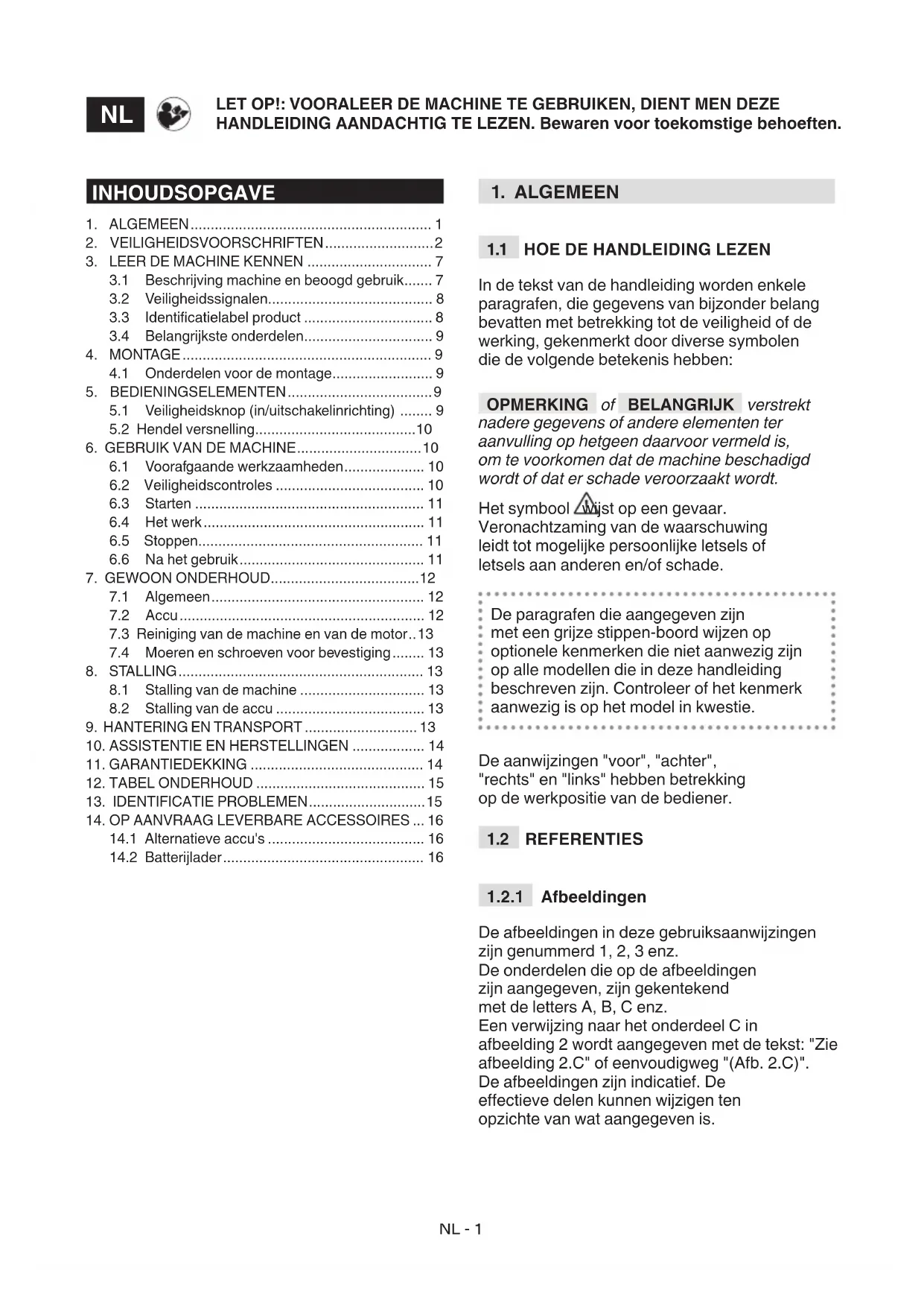 De afbeeldingen in deze gebruiksaanwijzingen zijn genummerd 1, 2, 3 enz. De onderdelen die op de afbeeldingen zijn aangegeven, zijn gekentekend met de letters A, B, C enz. Een verwijzing naar het onderdeel C in afbeelding 2 wordt aangegeven met de tekst: "Zie afbeelding 2.C" of eenvoudigweg "(Afb. 2.C)". De afbeeldingen zijn indicatief. De eectieve delen kunnen wijzigen ten opzichte van wat aangegeven is. INHOUDSOPGAVE