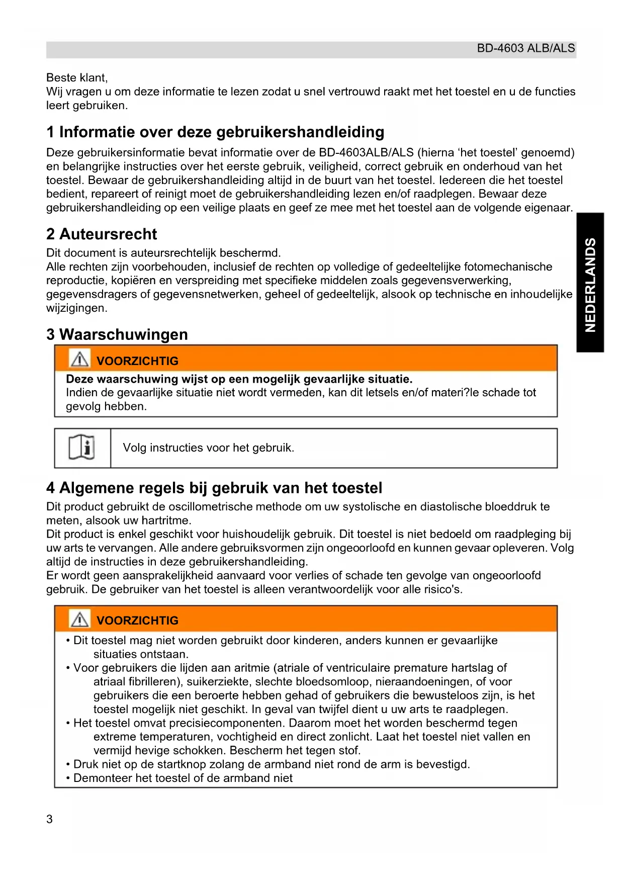Beste klant, Wij vragen u om deze informatie te lezen zodat u snel vertrouwd raakt met het toestel en u de functies leert gebruiken. 1 Informatie over deze gebruikershandleiding Deze gebruikersinformatie bevat informatie over de BD-4603ALB/ALS (hierna ‘het toestel’ genoemd) en belangrijke instructies over het eerste gebruik, veiligheid, correct gebruik en onderhoud van het toestel. Bewaar de gebruikershandleiding altijd in de buurt van het toestel. Iedereen die het toestel bedient, repareert of reinigt moet de gebruikershandleiding lezen en/of raadplegen. Bewaar deze gebruikershandleiding op een veilige plaats en geef ze mee met het toestel aan de volgende eigenaar. 2 Auteursrecht Dit document is auteursrechtelijk beschermd. Alle rechten zijn voorbehouden, inclusief de rechten op volledige of gedeeltelijke fotomechanische reproductie, kopiëren en verspreiding met specifieke middelen zoals gegevensverwerking, gegevensdragers of gegevensnetwerken, geheel of gedeeltelijk, alsook op technische en inhoudelijke wijzigingen. 3 Waarschuwingen 4 Algemene regels bij gebruik van het toestel Dit product gebruikt de oscillometrische methode om uw systolische en diastolische bloeddruk te meten, alsook uw hartritme. Dit product is enkel geschikt voor huishoudelijk gebruik. Dit toestel is niet bedoeld om raadpleging bij uw arts te vervangen. Alle andere gebruiksvormen zijn ongeoorloofd en kunnen gevaar opleveren. Volg altijd de instructies in deze gebruikershandleiding. Er wordt geen aansprakelijkheid aanvaard voor verlies of schade ten gevolge van ongeoorloofd gebruik. De gebruiker van het toestel is alleen verantwoordelijk voor alle risico's. VOORZICHTIG Deze waarschuwing wijst op een mogelijk gevaarlijke situatie. Indien de gevaarlijke situatie niet wordt vermeden, kan dit letsels en/of materi?le schade tot gevolg hebben. Volg instructies voor het gebruik. VOORZICHTIG