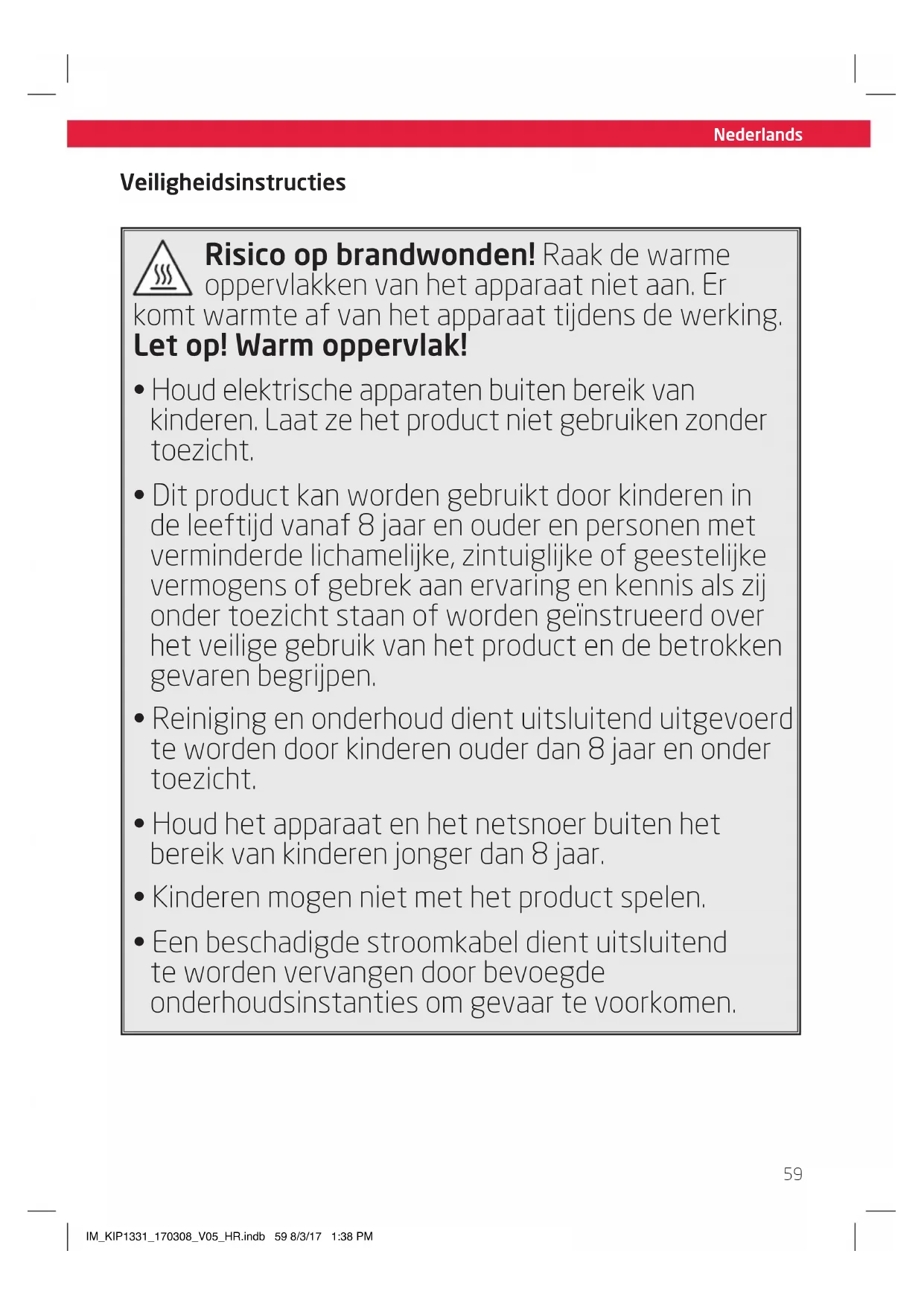 - Een beschadigde stroomkabel dient uitsluitend te worden vervangen door bevoegde onderhoudsinstanties om gevaar te voorkomen. IM_KIP1331_170308_V05_HR.indb 59 8/3/17 1:38 PMNederlands