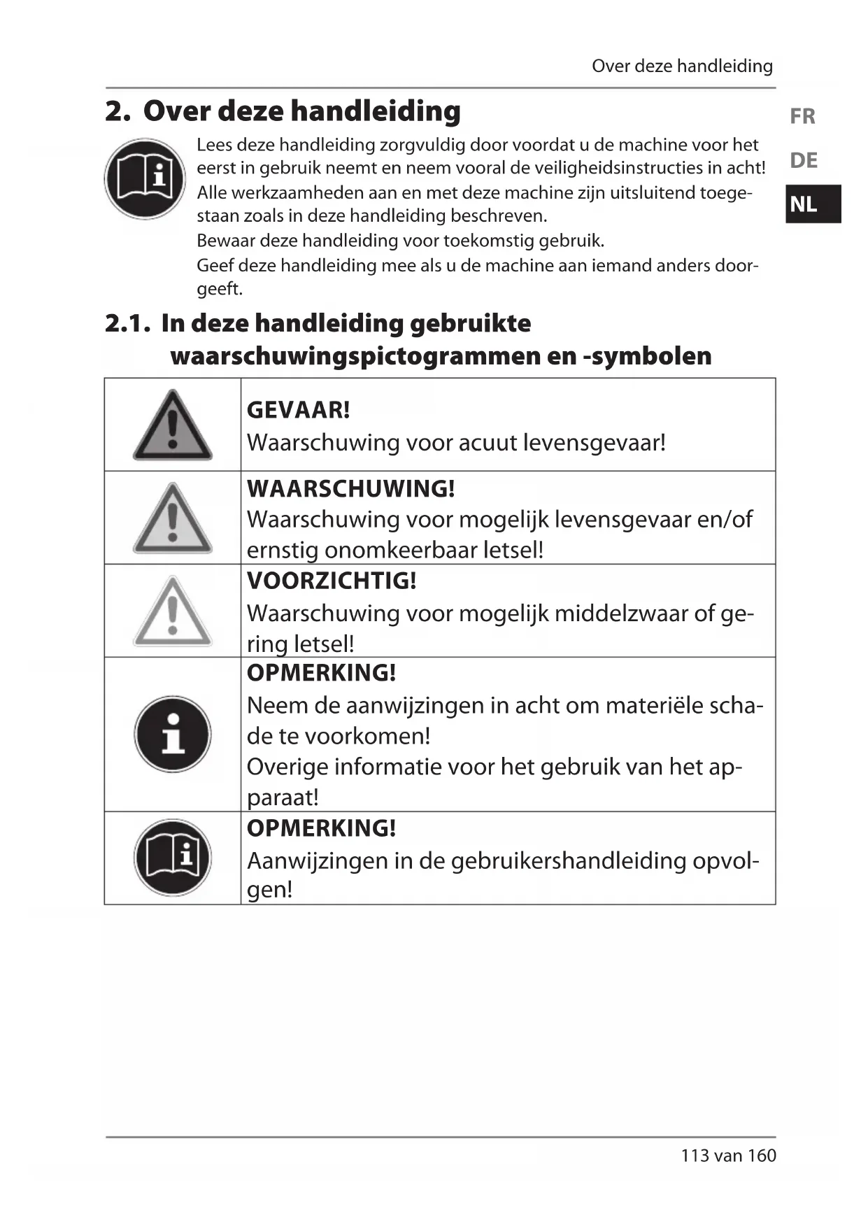 Lees deze handleiding zorgvuldig door voordat u de machine voor het eerst in gebruik neemt en neem vooral de veiligheidsinstructies in acht! Alle werkzaamheden aan en met deze machine zijn uitsluitend toege- staan zoals in deze handleiding beschreven. Bewaar deze handleiding voor toekomstig gebruik. Geef deze handleiding mee als u de machine aan iemand anders door- geeft. 2.1. In deze handleiding gebruikte waarschuwingspictogrammen en -symbolen GEVAAR! Waarschuwing voor acuut levensgevaar! WAARSCHUWING! Waarschuwing voor mogelijk levensgevaar en/of ernstig onomkeerbaar letsel! VOORZICHTIG! Waarschuwing voor mogelijk middelzwaar of ge- ring letsel! OPMERKING! Neem de aanwijzingen in acht om materiële scha- de te voorkomen! Overige informatie voor het gebruik van het ap- paraat! OPMERKING! Aanwijzingen in de gebruikershandleiding opvol- gen! 16600 FR Auchan FR Content MSN 5005 1153 final.indb 11316600 FR Auchan FR Content MSN 5005 1153 final.indb 113 29.07.2015 13:43:1029.07.2015 13:43:10114 van 160 Over deze handleiding 2.2. Gebruik voor het beoogde doel Deze machine biedt uitgebreide gebruiksmogelijkheden: De overlock-naaimachine kan worden gebruikt voor het aan elkaar naaien en afwer- ken van de naden in licht tot middelzwaar naaigoed. Het naaigoed kan bestaan uit textielvezels, samengestelde materialen of licht leer.