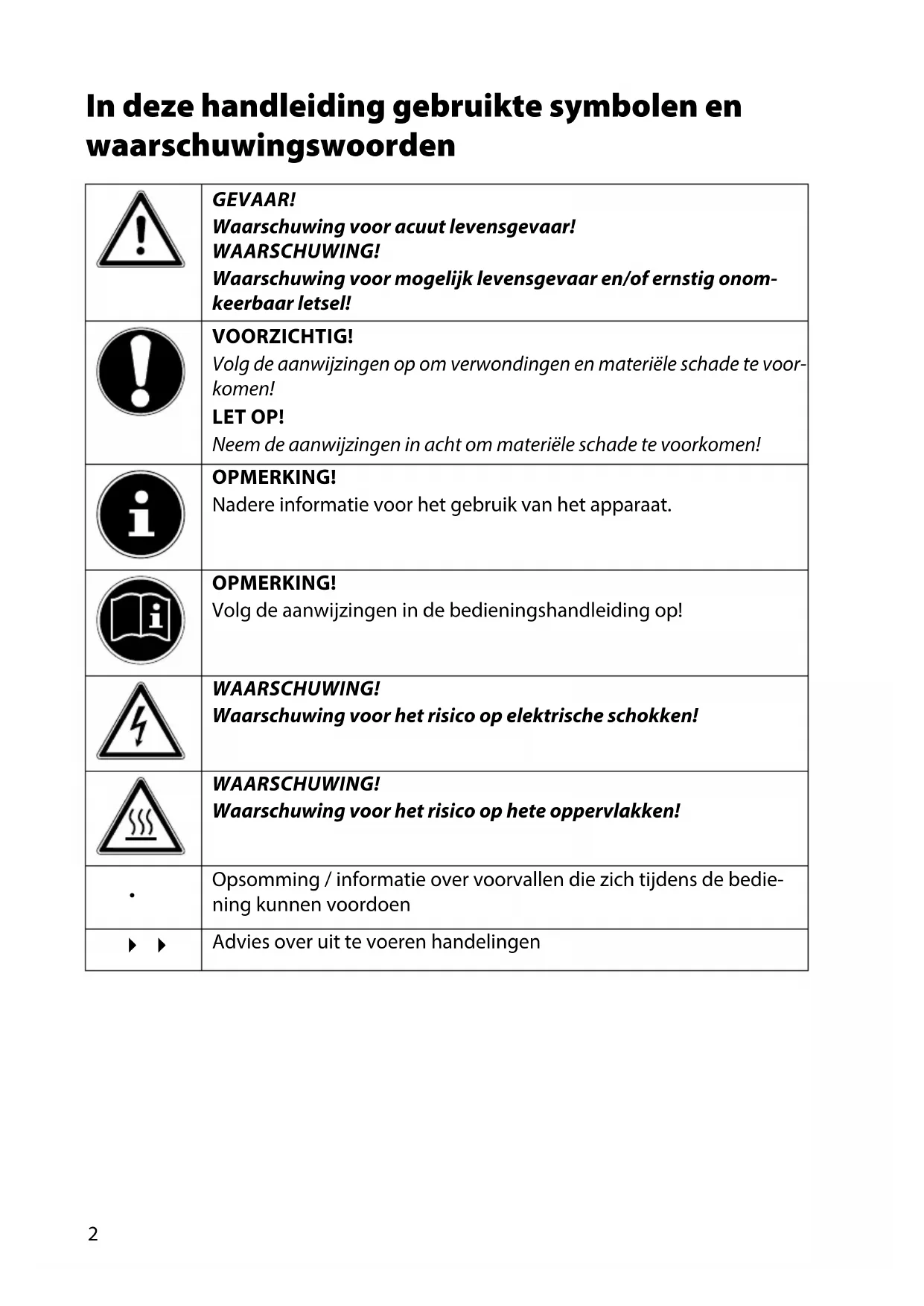 - De behuizing wordt heet tijdens het gebruik. Raak het apparaat tij- dens het gebruik daarom enkel aan op de daartoe voorziene knop- pen en handgrepen.