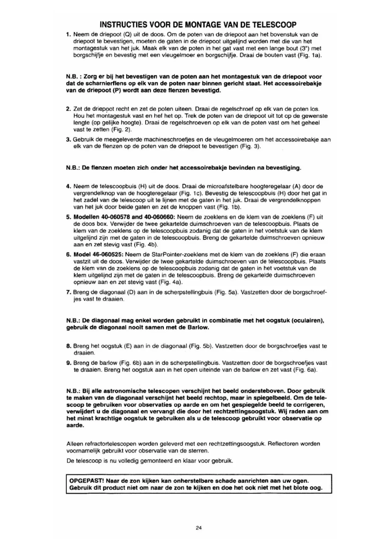 te draaien. Breng het oogstuk aan in het open uiteinde van de barlow en zet vast (Fig. 6a). N.B.: Bij alle astronomische telescopen verschijnt het beeld ondersteboven. Door gebruik te maken van de diagonaal verschijnt het beeld rechtop, maar in spiegelbeeld. Om de tele- scoop te gebruiken voor observaties op aarde en om het gespiegelde beeld te corrigeren, verwijdert u de diagonaal en vervangt die door het rechtzettingsoogstuk. Wij raden aan om het minst krachtige oogstuk te gebruiken als u de telescoop gebruikt voor observatie op aarde. Alleen refractortelescopen worden geleverd met een rechtzettingsoogstuk. Reflectoren worden voornamelijk gebruikt voor observatie van de sterren. De telescoop is nu volledig gemonteerd en klaar voor gebruik. OPGEPAST! Naar de zon kijken kan onherstelbare schade aanrichten aan uw ogen. Gebruik dit product niet om naar de zon te kijken en doe het ook niet met het blote oog.