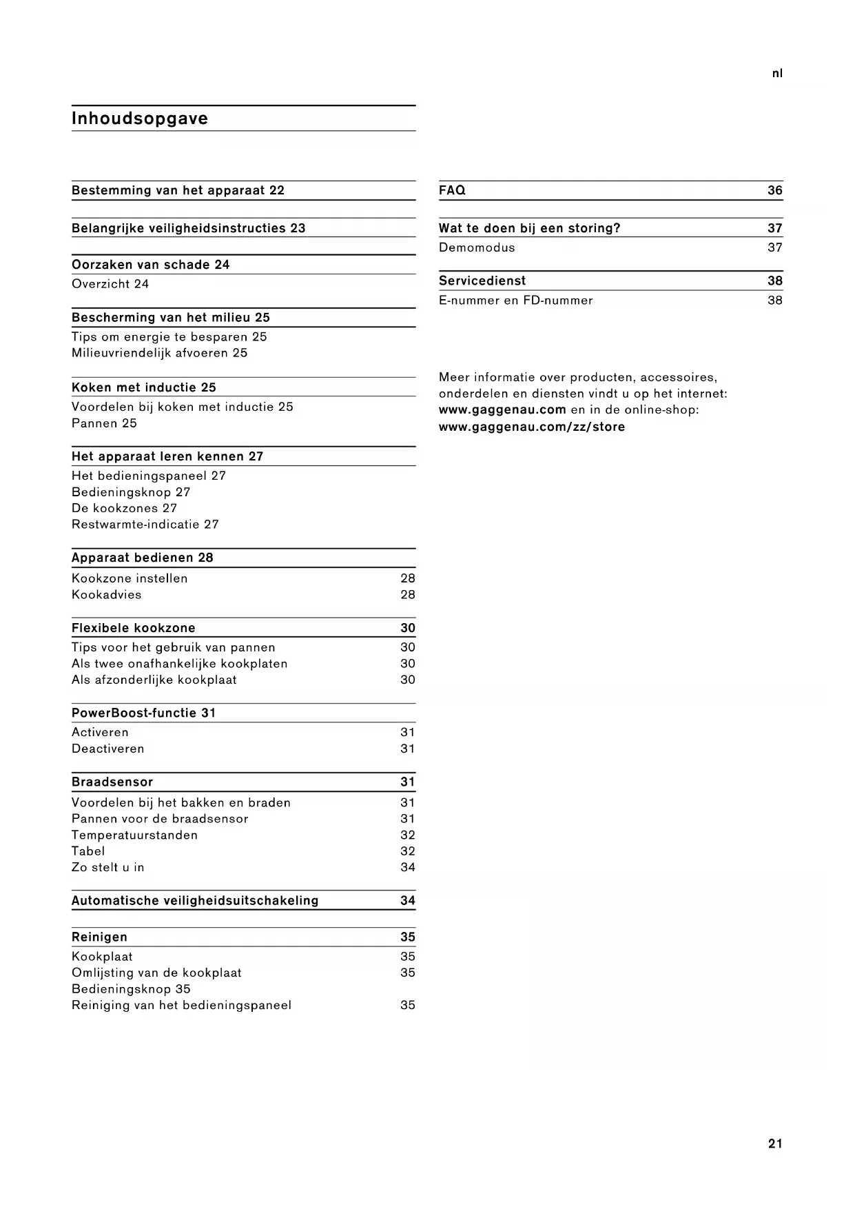 Inhoudsopgave Gebruiksaanwijzing Bestemming van het apparaat 22 Belangrijke veiligheidsinstructies 23 Oorzaken van schade 24 Overzicht 24 Bescherming van het milieu 25 Tips om energie te besparen 25 Milieuvriendelijk afvoeren 25 Koken met inductie 25 Voordelen bij koken met inductie 25 Pannen 25 Het apparaat leren kennen 27 Het bedieningspaneel 27 Bedieningsknop 27 De kookzones 27 Restwarmte-indicatie 27 Apparaat bedienen 28 Kookzone instellen 28 Kookadvies 28 Flexibele kookzone 30 Tips voor het gebruik van pannen 30 Als twee onafhankelijke kookplaten 30 Als afzonderlijke kookplaat 30 PowerBoost-functie 31 Activeren 31 Deactiveren 31 Braadsensor 31 Voordelen bij het bakken en braden 31 Pannen voor de braadsensor 31 Temperatuurstanden 32 Tabel 32 Zo stelt u in 34 Automatische veiligheidsuitschakeling 34 Reinigen 35 Kookplaat 35 Omlijsting van de kookplaat 35 Bedieningsknop 35 Reiniging van het bedieningspaneel 35 FAQ 36 Wat te doen bij een storing? 37 Demomodus 37 Servicedienst 38 E-nummer en FD-nummer 38 Meer informatie over producten, accessoires, onderdelen en diensten vindt u op het internet: www.gaggenau.com en in de online-shop: www.gaggenau.com/zz/store22 nl Kundendienst m Bestemming van het apparaat Lees deze gebruiksaanwijzing zorgvuldig door. Berg de gebruiksaanwijzing, het installatievoorschrift en de apparaatpas goed op voor later gebruik of om ze door te geven aan volgende eigenaren. Controleer het apparaat na het uitpakken. Indien het apparaat schade heeft opgelopen tijdens het transport, schakel het dan niet in, maar neem contact op met de technische dienst en leg de veroorzaakte schade schriftelijk vast. Doet u dat niet, dan gaat elk recht op een schadevergoeding verloren. Alleen een daartoe bevoegd vakman mag apparaten zonder stekker aansluiten. Bij schade door een verkeerde aansluiting maakt u geen aanspraak op garantie. Dit apparaat moet worden geïnstalleerd volgens het meegeleverde installatievoorschrift. Dit apparaat is alleen bestemd voor huishoudelijk gebruik en de huiselijke omgeving. Gebruik het apparaat uitsluitend voor het bereiden van gerechten en dranken. Het kookproces moet regelmatig worden gecontroleerd. Een kort kookproces moet continu in de gaten worden gehouden. Gebruik het apparaat alleen in gesloten ruimtes. Dit apparaat is bestemd voor gebruik tot op hoogten van maximaal 4.000 meter boven zeeniveau. Dek de kookplaat niet af. Dit kan leiden tot ongevallen, bijv. door oververhitting, ontbranding of ontploffend materiaal. Gebruik uitsluitend beveiligingsvoorzieningen of kindertralies die door ons zijn goedgekeurd. Ongeschikte beveiligingsvoorzieningen of kindertralies kunnen tot ongevallen leiden. Dit apparaat is niet bestemd voor gebruik met een externe tijdschakelklok of een afstandbediening. Dit toestel kan worden gebruikt door kinderen vanaf 8 jaar en door personen met beperkte fysieke, sensorische of geestelijke vermogens of personen die gebrek aan kennis of ervaring hebben, wanneer zij onder toezicht staan van een persoon die verantwoordelijk is voor hun veiligheid of geleerd hebben het op een veilige manier te gebruiken en zich bewust zijn van de risico's die het gebruik van het toestel met zich meebrengt. Kinderen mogen niet met het apparaat spelen. Reiniging en onderhoud van het toestel mogen niet worden uitgevoerd door kinderen, tenzij zij 15 aar of ouder zijn en onder toezicht staan. Zorg ervoor dat kinderen die jonger zijn dan 8 jaar uit de buurt blijven van het toestel of de aansluitkabel. Draagt u een actief geïmplanteerd medisch apparaat (bijv. een pacemaker of defibrillator), ga dan na of uw arts voldoet aan de richtlijn 90/385/EWG van de Raad van de Europese Gemeenschappen van 20 juni 1990 evenals DIN EN 45502-2-1 en DIN EN 45502-2-2 en dat het apparaat conform VDE-AR-E 2750-10 gekozen, geïmplanteerd en geprogrammeerd is. Is aan deze voorwaarden voldaan en worden bovendien non-ferro pannen met non-ferro handgrepen gebruikt, dan kan deze inductiekookplaat - als het op de juiste manier gebeurt - zonder bezwaar worden gebruikt.23 Kundendienst