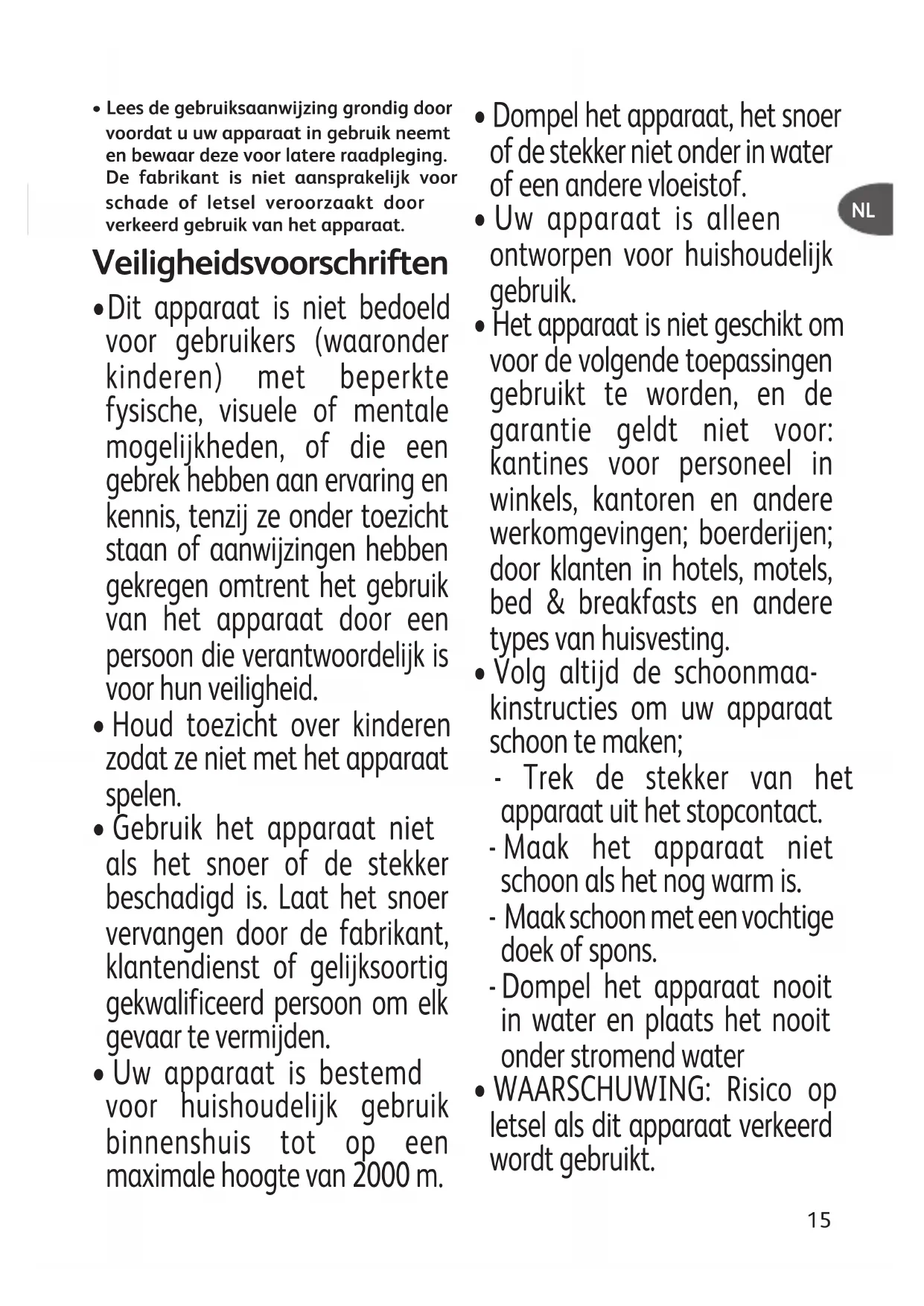 - Uw apparaat is bestemd voor huishoudelijk gebruik binnenshuis tot op een maximale hoogte van 2000 m.