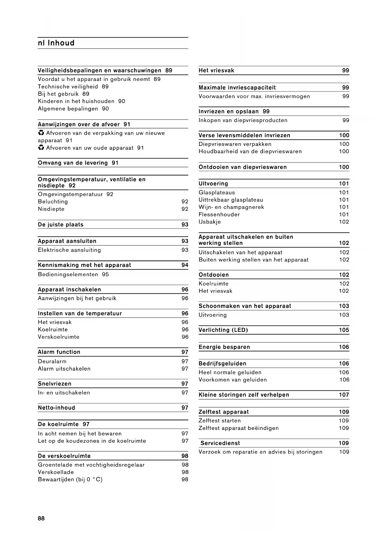 - Afvoeren van uw oude apparaat 91 Omvang van de levering 91 Omgevingstemperatuur, ventilatie en nisdiepte 92 Omgevingstemperatuur 92 Beluchting 92 Nisdiepte 92 De juiste plaats 93 Apparaat aansluiten 93 Elektrische aansluiting 93 Kennismaking met het apparaat 94 Bedieningselementen 95 Apparaat inschakelen 96 Aanwijzingen bij het gebruik 96 Instellen van de temperatuur 96 Het vriesvak 96 Koelruimte 96 Verskoelruimte 96 Alarm function 97 Deuralarm 97 Alarm uitschakelen 97 Snelvriezen 97 In- en uitschakelen 97 Netto-inhoud 97 De koelruimte 97 In acht nemen bij het bewaren 97 Let op de koudezones in de koelruimte 97 De verskoelruimte 98 Groentelade met vochtigheidsregelaar 98 Verskoellade 98 Bewaartijden (bij 0 °C) 98 Het vriesvak 99 Maximale invriescapaciteit 99 Voorwaarden voor max. invriesvermogen 99 Invriezen en opslaan 99 Inkopen van diepvriesproducten 99 Verse levensmiddelen invriezen 100 Diepvrieswaren verpakken 100 Houdbaarheid van de diepvrieswaren 100 Ontdooien van diepvrieswaren 100 Uitvoering 101 Glasplateaus 101 Uittrekbaar glasplateau 101 Wijn- en champagnerek 101 Flessenhouder 101 IJsbakje 102 Apparaat uitschakelen en buiten werking stellen 102 Uitschakelen van het apparaat 102 Buiten werking stellen van het apparaat 102 Ontdooien 102 Koelruimte 102 Het vriesvak 102 Schoonmaken van het apparaat 103 Uitvoering 103 Verlichting (LED) 105 Energie besparen 106 Bedrijfsgeluiden 106 Heel normale geluiden 106 Voorkomen van geluiden 106 Kleine storingen zelf verhelpen 107 Zelftest apparaat 109 Zelftest starten 109 Zelftest apparaat beëindigen 109 Servicedienst 109 Verzoek om reparatie en advies bij storingen 10989 m Veiligheidsbepalingen en waarschuwingen Voordat u het apparaat in gebruik neemt Lees de gebruiksaanwijzing en het installatievoorschrift nauwkeurig door. U vindt daarin belangrijke informatie over plaatsing, gebruik en onderhoud van het apparaat. De fabrikant aanvaardt geen aansprakelijkheid als de aanwijzingen en waarschuwingen in de gebruiksaanwijzing niet in acht worden genomen. Bewaar de gebruiksaanwijzing en het montagevoorschrift voor later gebruik of voor een eventuele latere bezitter. Technische veiligheid Het apparaat bevat een geringe hoeveelheid van het milieuvriendelijke maar brandbare koelmiddel R600a. Let erop dat de leidingen van het koelcircuit bij het transport of de installatie niet beschadigd worden. Koelmiddel dat naar buiten spuit kan vlam vatten of zich ontsteken. Bij beschadiging ▯ Open vuur of andere ontstekingsbronnen uit de buurt van het apparaat houden; ▯ Ruimte gedurende een paar minuten goed luchten; ▯ Apparaat uitschakelen en de stekker uit het stopcontact trekken; ▯ Contact opnemen met de Servicedienst. Hoe meer koelmiddel het apparaat bevat, des te groter moet de ruimte zijn waarin het apparaat wordt opgesteld. In een te kleine ruimte kan bij een lek een ontvlambaar mengsel van gas en lucht ontstaan. Per 8 g koelmiddel moet het vertrek minstens 1 m³ groot zijn. De hoeveelheid koelmiddel in uw apparaat vindt u op het typeplaatje aan de binnenkant van het apparaat. Als de aansluitkabel van het apparaat beschadigd raakt, moet deze worden vervangen door de fabrikant, de klantenservice of een andere gekwalificeerde persoon. Onvakkundige installatie en reparaties kunnen groot gevaar opleveren voor de bezitter. Reparaties mogen uitsluitend worden uitgevoerd door de fabrikant, de klantenservice of een andere gekwalificeerde persoon. Er mogen alleen originele onderdelen van de fabrikant gebruikt worden. Alleen bij deze onderdelen garandeert de fabrikant dat ze aan de veiligheidseisen voldoen. Een verlengsnoer voor de aansluitkabel mag uitsluitend via de klantenservice worden aangeschaft. Bij het gebruik ▯ Nooit elektrische apparaten in het apparaat gebruiken (bijv. verwarmingsapparaten, elektrische ijsmaker etc.). Explosiegevaar! ▯ Het apparaat nooit met een stoomreiniger ontdooien of schoonmaken! De hete stoom kan in de elektrische onderdelen terechtkomen en kortsluiting veroorzaken. Gevaar van elektrische schok! ▯ Gebruik geen puntige of scherpe voorwerpen om een laag ijs of rijp te verwijderen. U kunt hierdoor de koelleidingen beschadigen. Koelmiddel dat naar buiten spuit kan vlam vatten oftot oogletsel leiden. ▯ Geen producten met brandbare drijfgassen (bijv. spuitbussen) en geen explosieve stoffen in het apparaat opslaan. Explosiegevaar! ▯ Plint, uittrekbare manden of laden, deuren etc. niet als opstapje gebruiken of om op te leunen. ▯ Om te ontdooien of schoon te maken: stekker uit het stopcontact trekken resp. de zekering uitschakelen of losdraaien. Altijd aan de stekker trekken, nooit aan de aansluitkabel.90 ▯ Dranken met een hoog alcoholpercentage altijd goed afgesloten en staand bewaren. ▯ Geen olie of vet gebruiken op kunststof onderdelen en deurdichtingen. Ze kunnen poreus worden. ▯ De be- en ontluchtingsopeningen van het apparaat nooit afdekken. ▯ Vermijden van risico's voor kinderen en kwetsbare personen: Kwetsbaar zijn kinderen/personen met lichamelijke, geestelijke of zintuigelijk beperkingen, evenals personen die onvoldoende kennis hebben over de veilige bediening van het apparaat. Zorg ervoor dat kinderen en kwetsbare personen begrijpen wat de gevaren zijn. Een voor de veiligheid verantwoordelijke persoon moet toezicht houden op kinderen en kwetsbare personen bij het apparaat of hen instrueren. Alleen kinderen vanaf 8 jaar het apparaat laten gebruiken. Bij reiniging en onderhoud toezicht houden op kinderen. Laat kinderen nooit met het apparaat spelen. ▯ Flessen en blikjes met vloeistoffen – vooral koolzuurhoudende dranken – niet in de diepvriesruimte opslaan. Flessen en potten kunnen barsten! ▯ Diepvrieswaren nadat u ze uit de diepvriesruimte hebt gehaald, nooit onmiddellijk in de mond nemen. Kans op vrieswonden! ▯ Vermijd langdurig contact van uw handen met de diepvrieswaren, ijs of de verdamperbuizen enz. Kans op vrieswonden! Kinderen in het huishouden ▯ Verpakkingsmateriaal en onderdelen