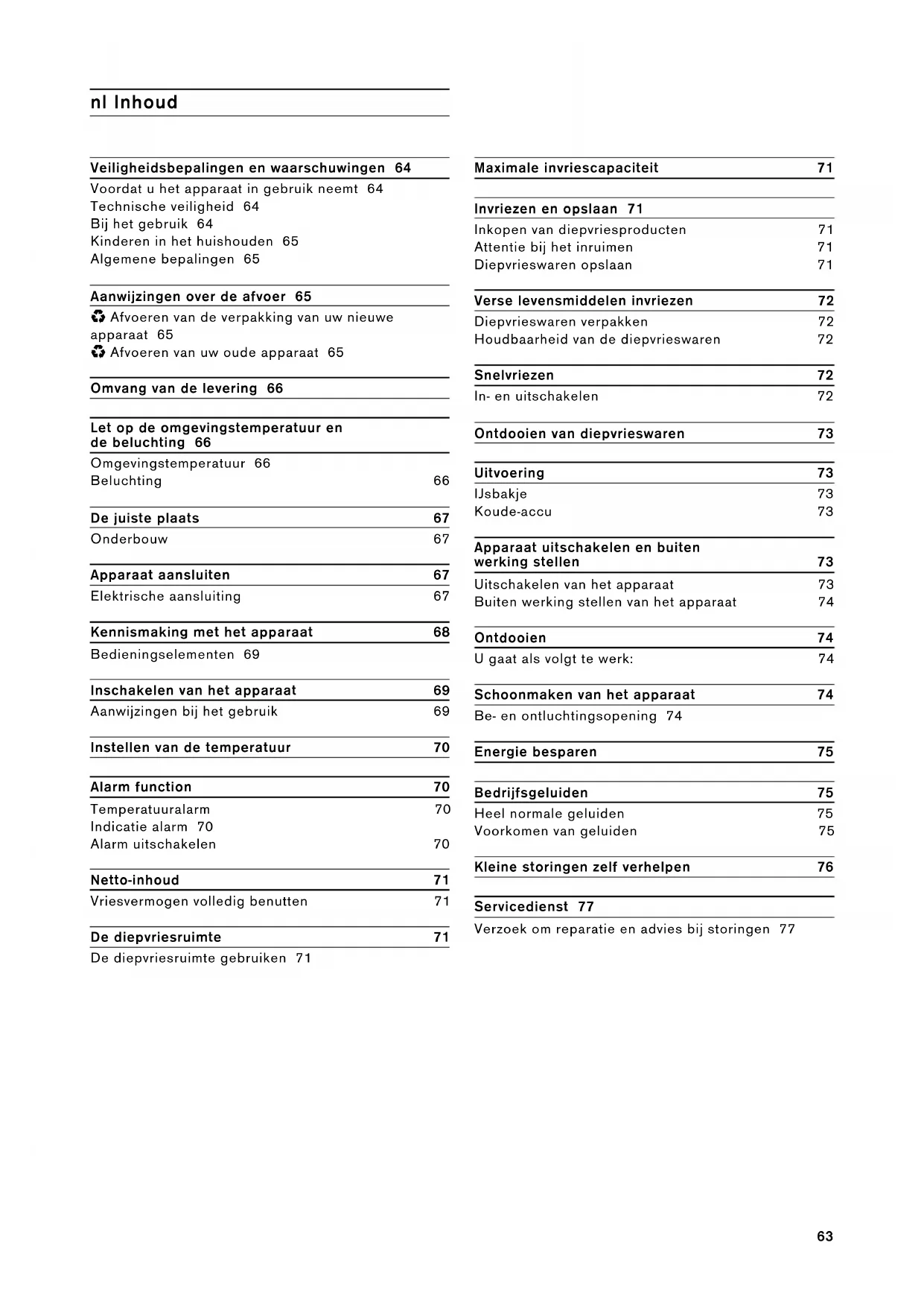 - Afvoeren van uw oude apparaat 65 Omvang van de levering 66 Let op de omgevingstemperatuur en de beluchting 66 Omgevingstemperatuur 66 Beluchting 66 De juiste plaats 67 Onderbouw 67 Apparaat aansluiten 67 Elektrische aansluiting 67 Kennismaking met het apparaat 68 Bedieningselementen 69 Inschakelen van het apparaat 69 Aanwijzingen bij het gebruik 69 Instellen van de temperatuur 70 Alarm function 70 Temperatuuralarm 70 Indicatie alarm 70 Alarm uitschakelen 70 Netto-inhoud 71 Vriesvermogen volledig benutten 71 De diepvriesruimte 71 De diepvriesruimte gebruiken 71 Maximale invriescapaciteit 71 Invriezen en opslaan 71 Inkopen van diepvriesproducten 71 Attentie bij het inruimen 71 Diepvrieswaren opslaan 71 Verse levensmiddelen invriezen 72 Diepvrieswaren verpakken 72 Houdbaarheid van de diepvrieswaren 72 Snelvriezen 72 In- en uitschakelen 72 Ontdooien van diepvrieswaren 73 Uitvoering 73 IJsbakje 73 Koude-accu 73 Apparaat uitschakelen en buiten werking stellen 73 Uitschakelen van het apparaat 73 Buiten werking stellen van het apparaat 74 Ontdooien 74 U gaat als volgt te werk: 74 Schoonmaken van het apparaat 74 Be- en ontluchtingsopening 74 Energie besparen 75 Bedrijfsgeluiden 75 Heel normale geluiden 75 Voorkomen van geluiden 75 Kleine storingen zelf verhelpen 76 Servicedienst 77 Verzoek om reparatie en advies bij storingen 7764 m Veiligheidsbepalingen en waarschuwingen Voordat u het apparaat in gebruik neemt Lees de gebruiksaanwijzing en het installatievoorschrift nauwkeurig door. U vindt daarin belangrijke informatie over plaatsing, gebruik en onderhoud van het apparaat. De fabrikant aanvaardt geen aansprakelijkheid als de aanwijzingen en waarschuwingen in de gebruiksaanwijzing niet in acht worden genomen. Bewaar de gebruiksaanwijzing en het montagevoorschrift voor later gebruik of voor een eventuele latere bezitter. Technische veiligheid Het apparaat bevat een geringe hoeveelheid van het milieuvriendelijke maar brandbare koelmiddel R600a. Let erop dat de leidingen van het koelcircuit bij het transport of de installatie niet beschadigd worden. Koelmiddel dat naar buiten spuit kan vlam vatten of zich ontsteken. Bij beschadiging ▯ Open vuur of andere ontstekingsbronnen uit de buurt van het apparaat houden; ▯ Ruimte gedurende een paar minuten goed luchten; ▯ Apparaat uitschakelen en de stekker uit het stopcontact trekken; ▯ Contact opnemen met de Servicedienst. Hoe meer koelmiddel het apparaat bevat, des te groter moet de ruimte zijn waarin het apparaat wordt opgesteld. In een te kleine ruimte kan bij een lek een ontvlambaar mengsel van gas en lucht ontstaan. Per 8 g koelmiddel moet het vertrek minstens 1 m³ groot zijn. De hoeveelheid koelmiddel in uw apparaat vindt u op het typeplaatje aan de binnenkant van het apparaat. Als de aansluitkabel van het apparaat beschadigd raakt, moet deze worden vervangen door de fabrikant, de klantenservice of een andere gekwalificeerde persoon. Onvakkundige installatie en reparaties kunnen groot gevaar opleveren voor de bezitter. Reparaties mogen uitsluitend worden uitgevoerd door de fabrikant, de klantenservice of een andere gekwalificeerde persoon. Er mogen alleen originele onderdelen van de fabrikant gebruikt worden. Alleen bij deze onderdelen garandeert de fabrikant dat ze aan de veiligheidseisen voldoen. Een verlengsnoer voor de aansluitkabel mag uitsluitend via de klantenservice worden aangeschaft. Bij het gebruik ▯ Nooit elektrische apparaten in het apparaat gebruiken (bijv. verwarmingsapparaten, elektrische ijsmaker etc.). Explosiegevaar! ▯ Het apparaat nooit met een stoomreiniger ontdooien of schoonmaken! De hete stoom kan in de elektrische onderdelen terechtkomen en kortsluiting veroorzaken. Gevaar van elektrische schok! ▯ Gebruik geen puntige of scherpe voorwerpen om een laag ijs of rijp te verwijderen. U kunt hierdoor de koelleidingen beschadigen. Koelmiddel dat naar buiten spuit kan vlam vatten oftot oogletsel leiden. ▯ Geen producten met brandbare drijfgassen (bijv. spuitbussen) en geen explosieve stoffen in het apparaat opslaan. Explosiegevaar! ▯ Plint, uittrekbare manden of laden, deuren etc. niet als opstapje gebruiken of om op te leunen. ▯ Om te ontdooien of schoon te maken: stekker uit het stopcontact trekken resp. de zekering uitschakelen of losdraaien. Altijd aan de stekker trekken, nooit aan de aansluitkabel. ▯ Dranken met een hoog alcoholpercentage altijd goed afgesloten en staand bewaren.65 ▯ Geen olie of vet gebruiken op kunststof onderdelen en deurdichtingen. Ze kunnen poreus worden. ▯ De be- en ontluchtingsopeningen van het apparaat nooit afdekken. ▯ Vermijden van risico's voor kinderen en kwetsbare personen: Kwetsbaar zijn kinderen/personen met lichamelijke, geestelijke of zintuigelijk beperkingen, evenals personen die onvoldoende kennis hebben over de veilige bediening van het apparaat. Zorg ervoor dat kinderen en kwetsbare personen begrijpen wat de gevaren zijn. Een voor de veiligheid verantwoordelijke persoon moet toezicht houden op kinderen en kwetsbare personen bij het apparaat of hen instrueren. Alleen kinderen vanaf 8 jaar het apparaat laten gebruiken. Bij reiniging en onderhoud toezicht houden op kinderen. Laat kinderen nooit met het apparaat spelen. ▯ Flessen en blikjes met vloeistoffen – vooral koolzuurhoudende dranken – niet in de diepvriesruimte opslaan. Flessen en potten kunnen barsten! ▯ Diepvrieswaren nadat u ze uit de diepvriesruimte hebt gehaald, nooit onmiddellijk in de mond nemen. Kans op vrieswonden! ▯ Vermijd langdurig contact van uw handen met de diepvrieswaren, ijs of de verdamperbuizen enz. Kans op vrieswonden! Kinderen in het huishouden ▯ Verpakkingsmateriaal en onderdelen ervan zijn geen speelgoed voor kinderen. Verstikkingsgevaar door opvouwbare kartonnen dozen en folie! ▯ Het apparaat is geen speelgoed voor kinderen! ▯ Bij een apparaat met deurslot: sleutel buiten het bereik van kinderen bewaren! Algemene bepalingen Het apparaat is geschikt ▯ voor het invriez