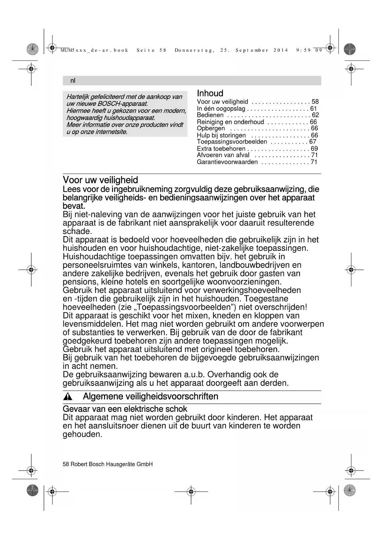 - Con riserva di modifiche. MUM5xxx_de-ar.book Seite 57 Donnerstag, 25. September 2014 9:59 0958 5.960-552 A ТТТТТ (02/03) 58 Robert Bosch Hausgeräte GmbH Inhoud Рoor uс veiligheid p. 58
