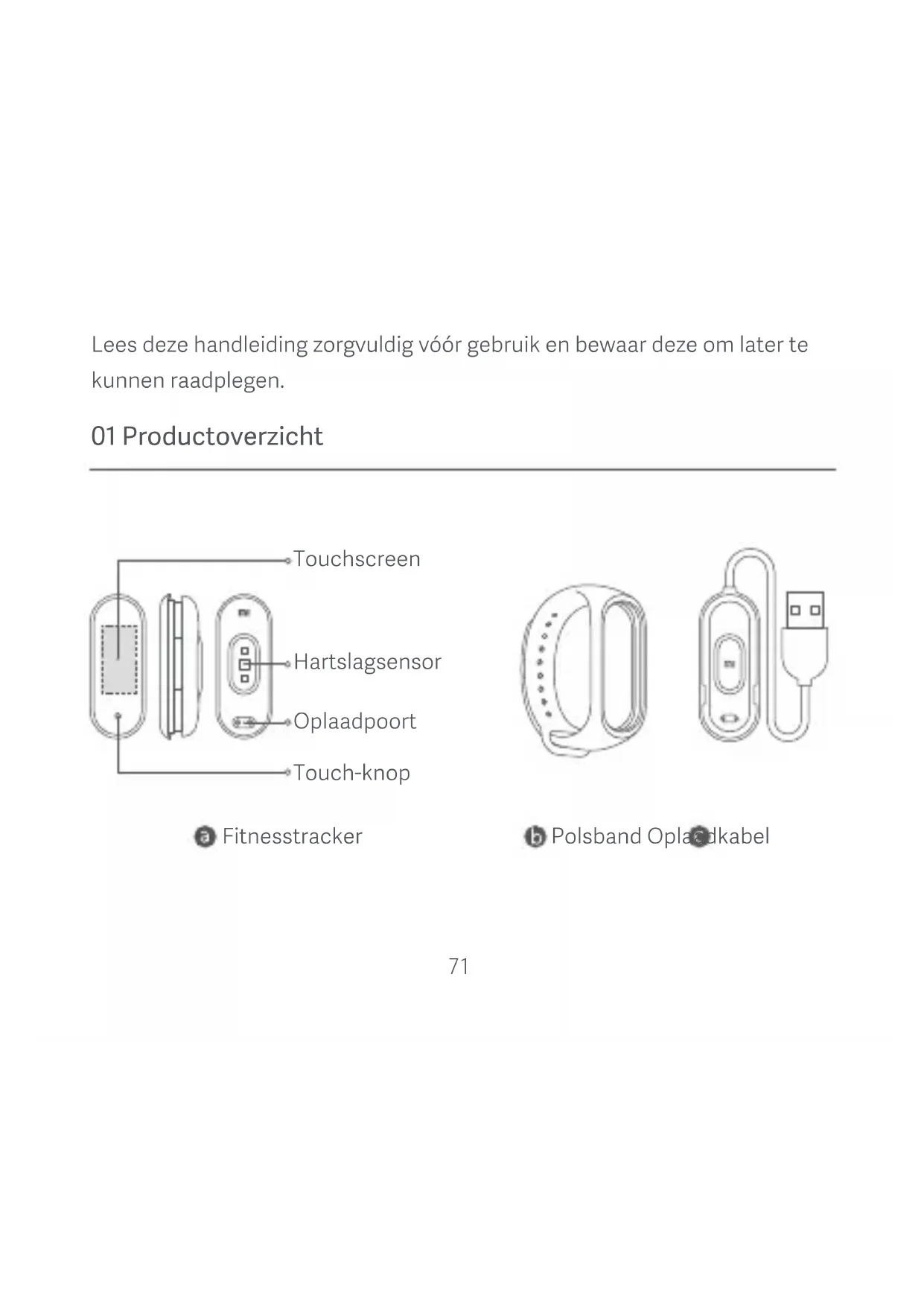 met uw apparaat te verbinden en te koppelen. Wanneer de Mi Band begint te trillen en de melding Koppelen via Bluetooth op het scherm verschijnt, drukt u op de knop om het koppelingsproces te voltooien. Opmerking: zorg ervoor dat Bluetooth op uw telefoon is ingeschakeld. Houd de band in de buurt van uw telefoon tijdens het koppelingsproces. Koppel de telefoon Koppel de telefoon Band hee geen koppelverzoek ontvangen Bevestig op de band76 05 Gebruik Nadat de band met uw apparaat is gekoppeld, begint deze uw dagelijkse activiteiten en slaapgewoonten te volgen en te analyseren. Raak de knop aan om het scherm te activeren. Vervolgens kunt u omhoog of omlaag vegen om toegang te krijgen tot vele andere functies, waaronder het bladeren door uw activiteitsgegevens en het meten van uw hartslag. Veeg omhoog/omlaag om te schakelen tussen functies Veeg naar rechts om terug te gaan naar de vorige pagina77 06 Demontage Verwijder de band van uw pols, houd de uiteinden vast en trek aan de polsband totdat u een kleine opening ziet tussen de fitnesstracker en de polsband. Gebruik uw vinger om de fitnesstracker uit de gleuf aan de voorkant van de polsband te halen.78 07 Opladen Laad uw band onmiddellijk op wanneer het baerijniveau laag is.79 08 Voorzorgsmaatregelen Wanneer u de Mi Band gebruikt om uw hartslag te meten, houd uw pols dan stil. De Mi Smart Band 4 hee een waterbestendigheid van 5 ATM (50 meter). Deze kan worden gedragen in de douche, het zwembad of tijdens het zwemmen in de buurt van de kust. Deze kan echter niet worden gebruikt in een sauna of tijdens diepzeeduiken. De touch-knop en het touchscreen functioneren niet onder water. Wanneer de Mi Band in contact is geweest met water, gebruik dan een zachte doek om overtollig water van het oppervlak te vegen voordat u het apparaat gebruikt. Draag de band tijdens dagelijks gebruik niet te strak en houd het gebied tussen uw pols en de polsband droog. Maak de polsband regelmatig schoon met water. Stop onmiddellijk met het gebruik van het product en zoek medische hulp wanneer tekens van roodheid of zwelling verschijnen op het contactgebied op uw huid.Naam: Mi Smart Band 4 Model: XMSH07HM Neogewicht: 10,6 g (fitnesstracker) Afmetingen: 46,8 x 17,8 x 12,6 mm (fitnesstracker) Polsbandmateriaal: Thermoplastisch elastomeer Materiaal van de sluiting: Aluminiumlegering Verstelbare lengte: 155–216 mm Compatibel met: Android 4.4 en iOS 9.0 of hoger Baerijcapaciteit: 135 mAh Baerijtype: Lithium-polymeer baerij Ingangsspanning: DC 5.0 V Ingangsstroom: 250 mA Max. IP-classificatie: 5 ATM Frequentie band: 2402–2480 MHz Maximale output: 0 dBm Bedrijfstemperatuur: -10°C ~ 50°C Draadloze connectiviteit: Bluetooth 5.0 BLE