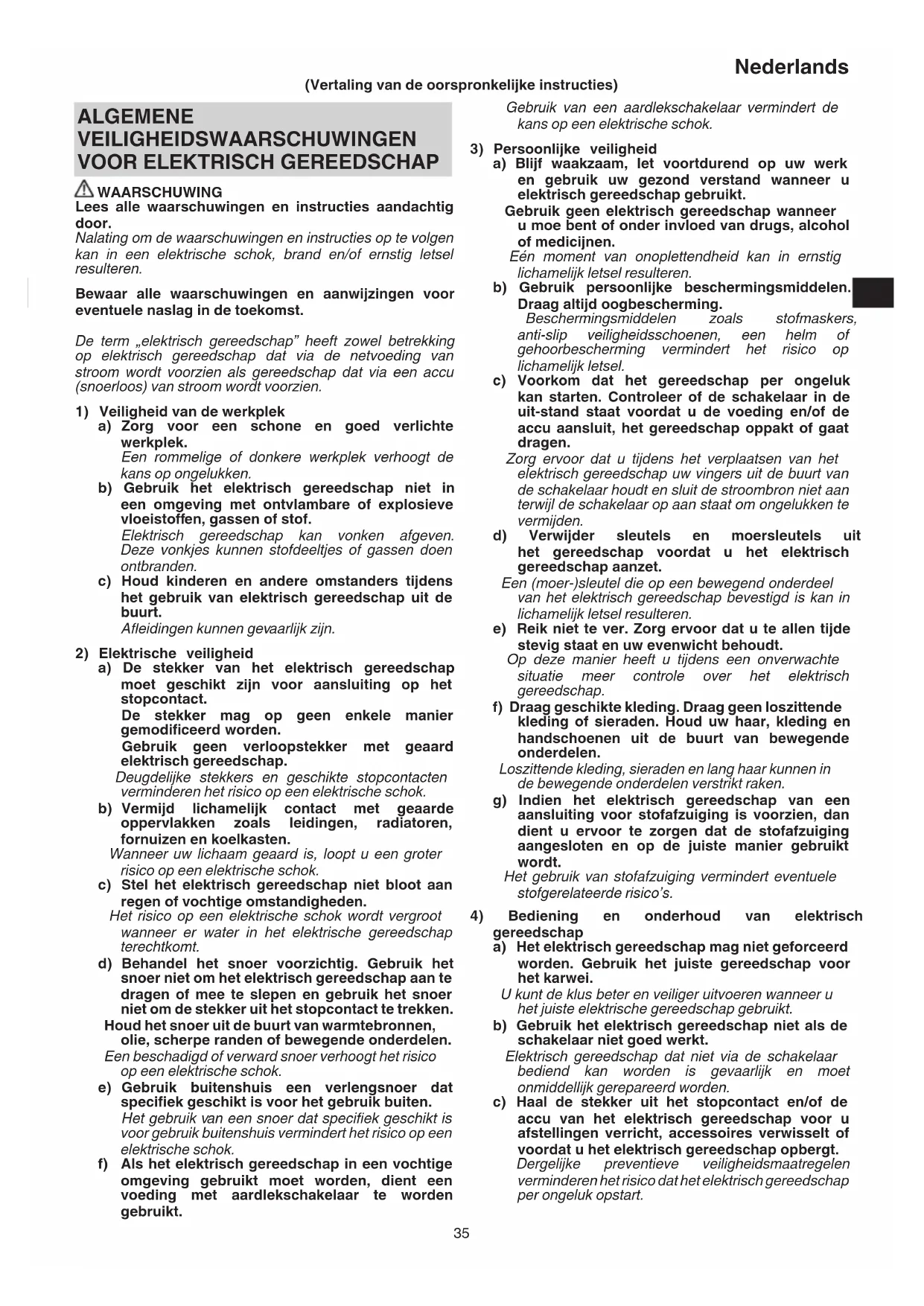 WAARSCHUWING Lees alle waarschuwingen en instructies aandachtig door. Nalating om de waarschuwingen en instructies op te volgen kan in een elektrische schok, brand en/of ernstig letsel resulteren. Bewaar alle waarschuwingen en aanwijzingen voor eventuele naslag in de toekomst. De term „elektrisch gereedschap” heeft zowel betrekking op elektrisch gereedschap dat via de netvoeding van stroom wordt voorzien als gereedschap dat via een accu (snoerloos) van stroom wordt voorzien.