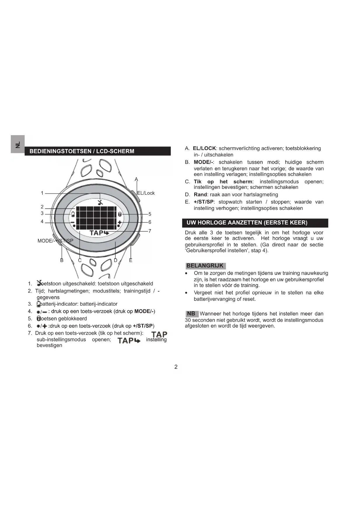 sub-instellingsmodus openen; instellinginstelling bevestigen A. EL/LOCK: schermverlichting activeren; toetsblokkering in- / uitschakelen B. MODE/-: schakelen tussen modi; huidige scherm verlaten en terugkeren naar het vorige; de waarde van een instelling verlagen; instellingsopties schakelen C. Tik op het scherm: instellingsmodus openen; instellingen bevestigen; schermen schakelen D. Rand: raak aan voor hartslagmeting E. +/ST/SP: stopwatch starten / stoppen; waarde van instelling verhogen; instellingsopties schakelen UW HORLOGE AANZETTEN (EERSTE KEER) Druk alle 3 de toetsen tegelijk in om het horloge voor de eerste keer te activeren. Het horloge vraagt u uw gebruikersproel in te stellen. (Ga direct naar de sectie ‘Gebruikersproel instellen’, stap 4). BELANGRIJK