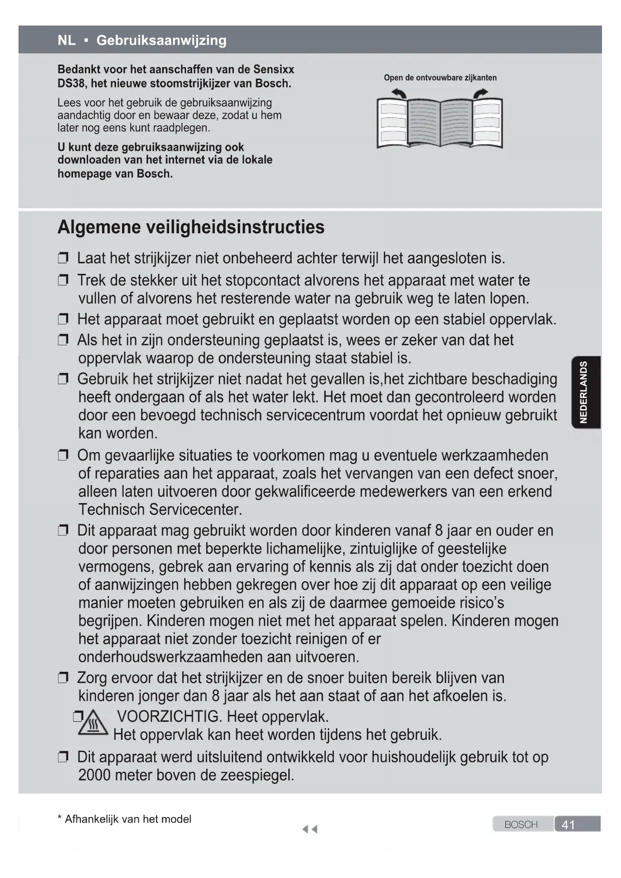 VOORZICHTIG. Heet oppervlak. Het oppervlak kan heet worden tijdens het gebruik. ❐ Dit apparaat werd uitsluitend ontwikkeld voor huishoudelijk gebruik tot op 2000 meter boven de zeespiegel. Bedankt voor het aanschaffen van de Sensixx DS38, het nieuwe stoomstrijkijzer van Bosch. Lees voor het gebruik de gebruiksaanwijzing aandachtig door en bewaar deze, zodat u hem later nog eens kunt raadplegen. U kunt deze gebruiksaanwijzing ook downloaden van het internet via de lokale homepage van Bosch. Open de ontvouwbare zijkanten NL • Gebruiksaanwijzing42 B O S C H