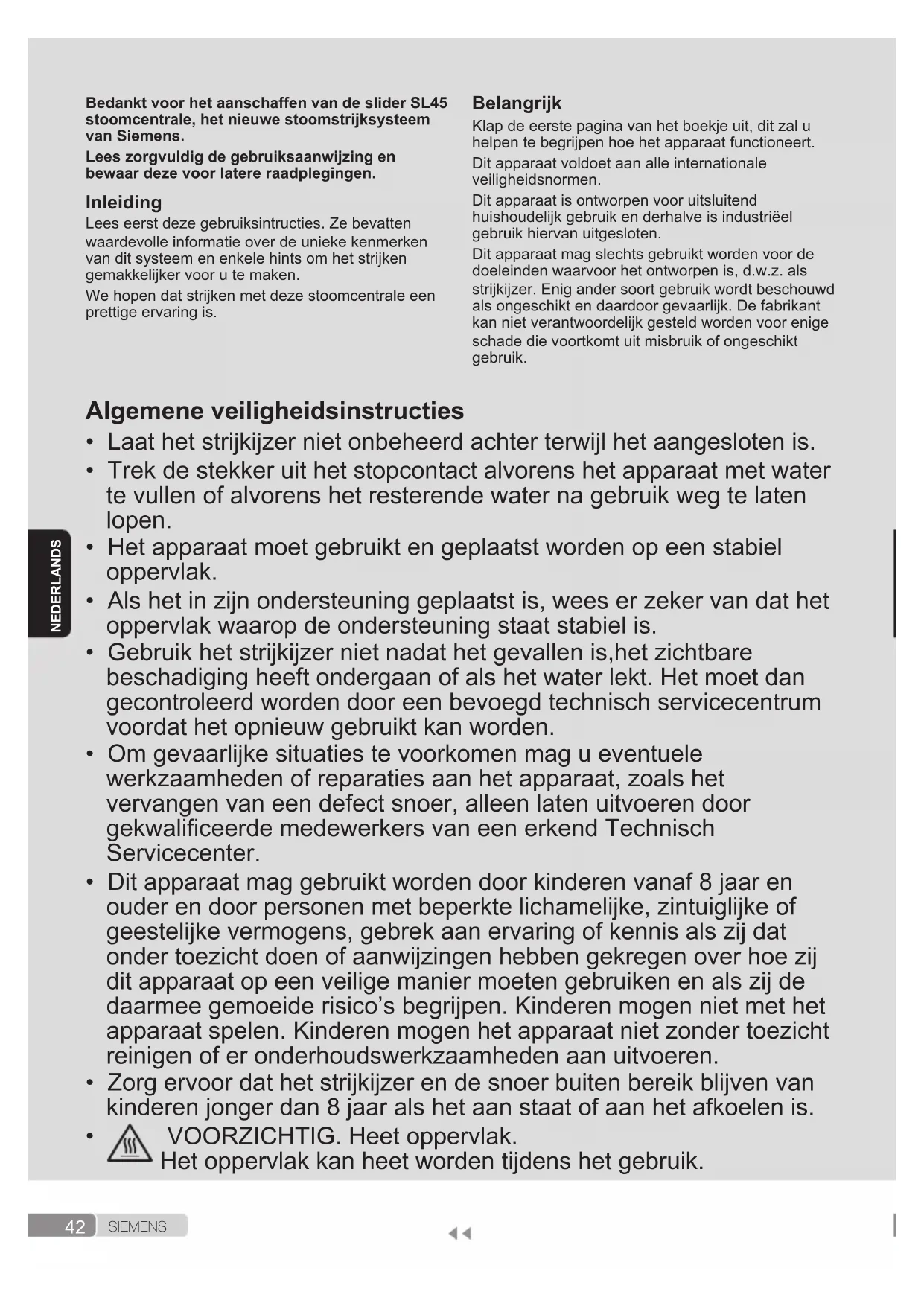 Dit apparaat bereikt hoge temperaturen en produceert stoom gedurende het gebruik. Dit kan brandwonden veroorzaken bij oneigenlijk gebruik. De stoomslang, het basisstation, de metalen plaat aan de onderzijde van de afneembare onderzetter (2) en vooral het strijkijzer zelf kunnen erg heet worden tijdens het gebruik. Dit is normaal. Richt de stoom nooit op mensen of dieren. Voorkom dat het snoer in aanraking komt met de hete zoolplaat. Let erop dat het systeem nog korte tijd kan stoom kan afgeven nadat de stoomhendel wordt losgelaten. Dit is een normale functie.44 S I E M E N S