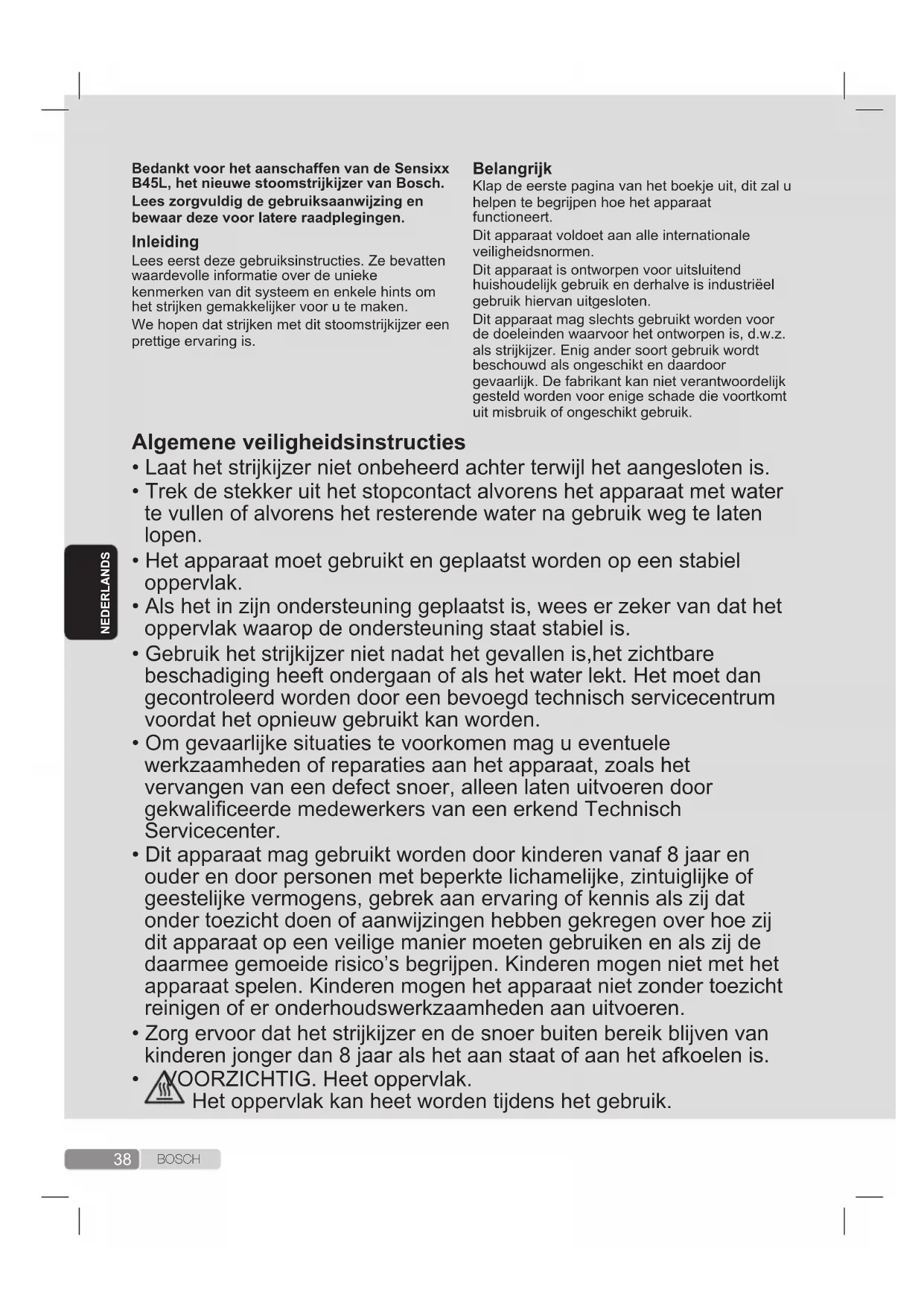 - Premere nuovamente la levetta e il ferro smetterà subito di emettere vapore. Se le indicazioni sopra riportate non risolvono il problema, contattare l’assistenza tecnica autorizzata. PuòscaricareilformatodigitalediquestomanualenelsitoInternetdiBosch.38 B O S C H NEDERLANDS BedanktvoorhetaanschaffenvandeSensixx B45L,hetnieuwestoomstrijkijzervanBosch. Leeszorgvuldigdegebruiksaanwijzingen bewaardezevoorlatereraadplegingen. Inleiding Lees eerst deze gebruiksinstructies. Ze bevatten waardevolle informatie over de unieke kenmerken van dit systeem en enkele hints om het strijken gemakkelijker voor u te maken. We hopen dat strijken met dit stoomstrijkijzer een prettige ervaring is. Belangrijk Klap de eerste pagina van het boekje uit, dit zal u helpen te begrijpen hoe het apparaat functioneert. Dit apparaat voldoet aan alle internationale veiligheidsnormen. Dit apparaat is ontworpen voor uitsluitend huishoudelijk gebruik en derhalve is industriëel gebruik hiervan uitgesloten. Dit apparaat mag slechts gebruikt worden voor de doeleinden waarvoor het ontworpen is, d.w.z. als strijkijzer. Enig ander soort gebruik wordt beschouwd als ongeschikt en daardoor gevaarlijk. De fabrikant kan niet verantwoordelijk gesteld worden voor enige schade die voortkomt uit misbruik of ongeschikt gebruik. Algemeneveiligheidsinstructies