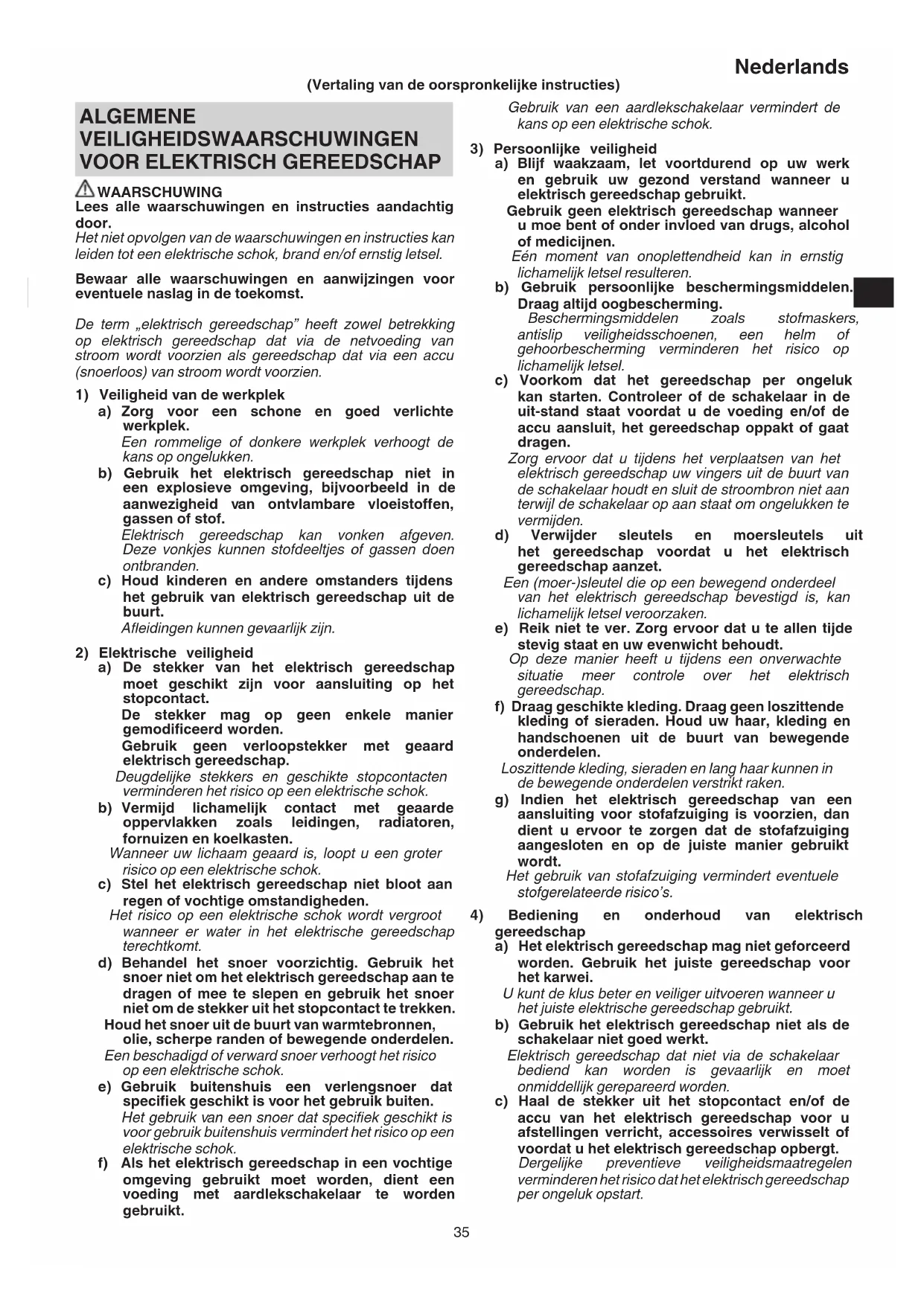 WAARSCHUWING Lees alle waarschuwingen en instructies aandachtig door. Het niet opvolgen van de waarschuwingen en instructies kan leiden tot een elektrische schok, brand en/of ernstig letsel. Bewaar alle waarschuwingen en aanwijzingen voor eventuele naslag in de toekomst. De term „elektrisch gereedschap” heeft zowel betrekking op elektrisch gereedschap dat via de netvoeding van stroom wordt voorzien als gereedschap dat via een accu (snoerloos) van stroom wordt voorzien.