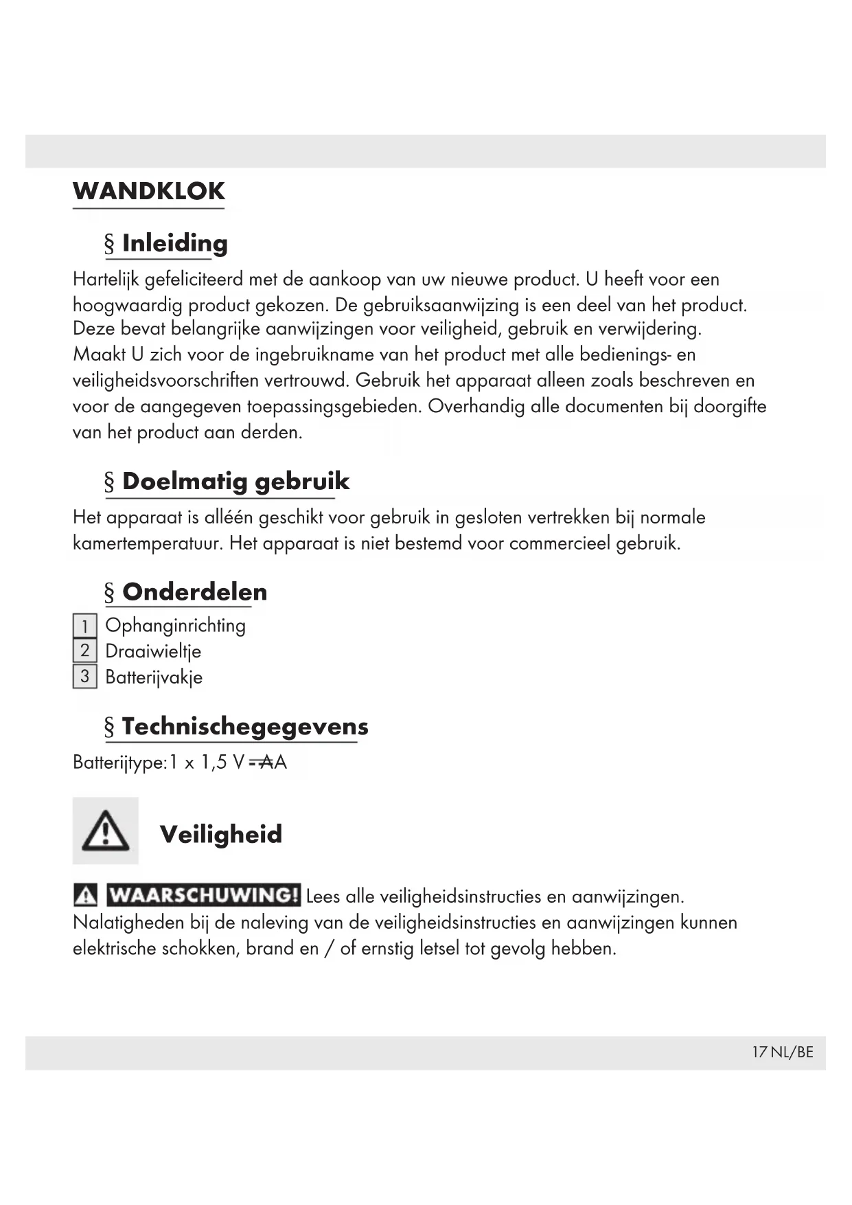 Batterijvakje § Technische gegevens Batterijtype:1 x 1,5 V AA Veiligheid Lees alle veiligheidsinstructies en aanwijzingen. Nalatigheden bij de naleving van de veiligheidsinstructies en aanwijzingen kunnen elektrische schokken, brand en / of ernstig letsel tot gevolg hebben.18 NL/BE Algemene veiligheidsinstructies