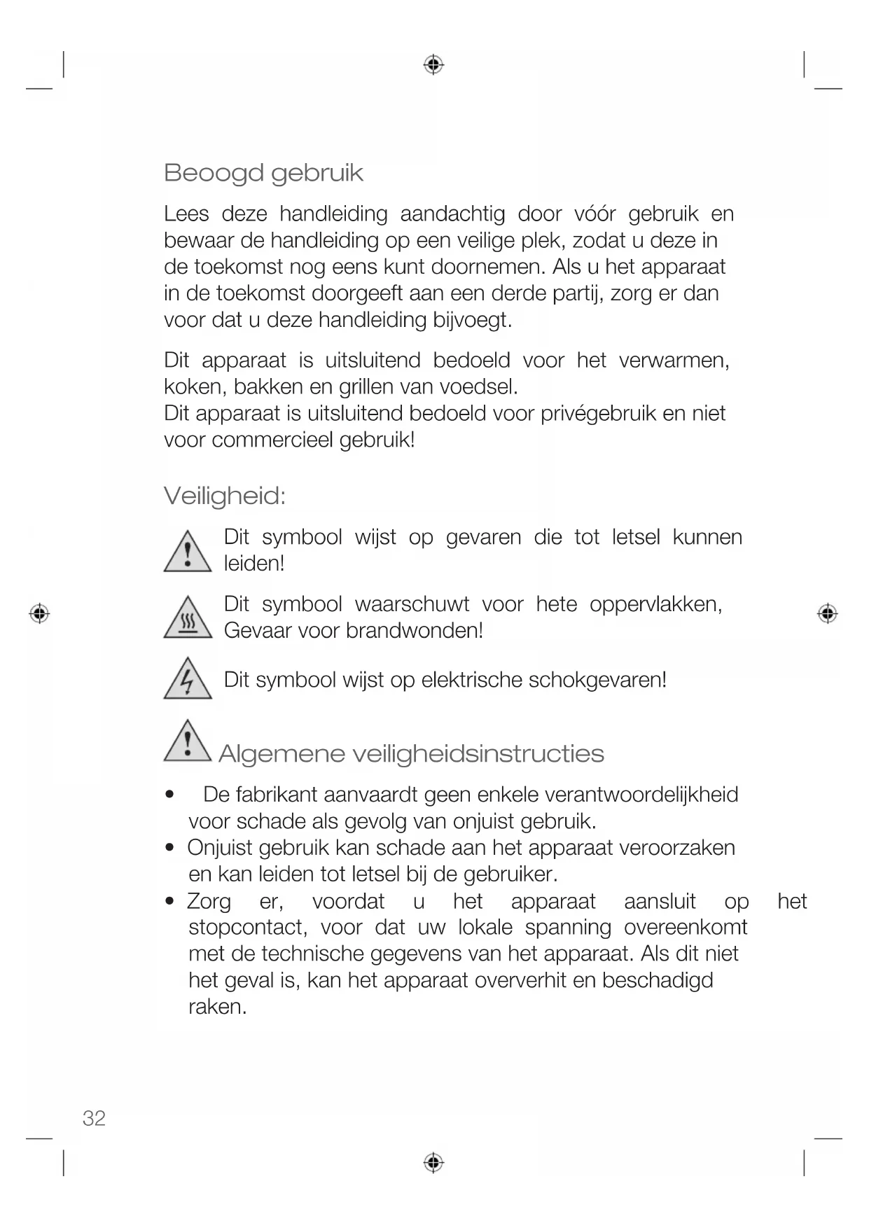 - fordamagescausedbyowner This guarantee does not affect your statutory right, nor any legal right you may have as a costumer under applicable national legislation governing the purchase of goods. Inordertoasserthis/herrightinaguaranteecaseduringthe guaranteed period, the customer must provide evidence of thedateofpurchase(receipt). The guarantee is to be asserted against KORONA electric GmbH, Sundern/Germany. Service Address: KORONA Service, Am Steinbach 9, 59872 Meschede, Germany Telephone Hotline: 02933 90284-80 Mail: service@korona-electric.de web: www.korona-electric.de within 2 years after the date of purchase. In case of guarantee the customer is given the right to get the appliance repaired at our own or at an authorized shop. Further rights (due to guaranteecase)arenotgiventothecustomer.32 Beoogd gebruik Lees deze handleiding aandachtig door vóór gebruik en bewaar de handleiding op een veilige plek, zodat u deze in de toekomst nog eens kunt doornemen. Als u het apparaat in de toekomst doorgeeft aan een derde partij, zorg er dan voor dat u deze handleiding bijvoegt. Dit apparaat is uitsluitend bedoeld voor het verwarmen, koken, bakken en grillen van voedsel. Dit apparaat is uitsluitend bedoeld voor privégebruik en niet voor commercieel gebruik! Veiligheid: Dit symbool wijst op gevaren die tot letsel kunnen leiden! Dit symbool waarschuwt voor hete oppervlakken, Gevaar voor brandwonden! Dit symbool wijst op elektrische schokgevaren! Algemene veiligheidsinstructies