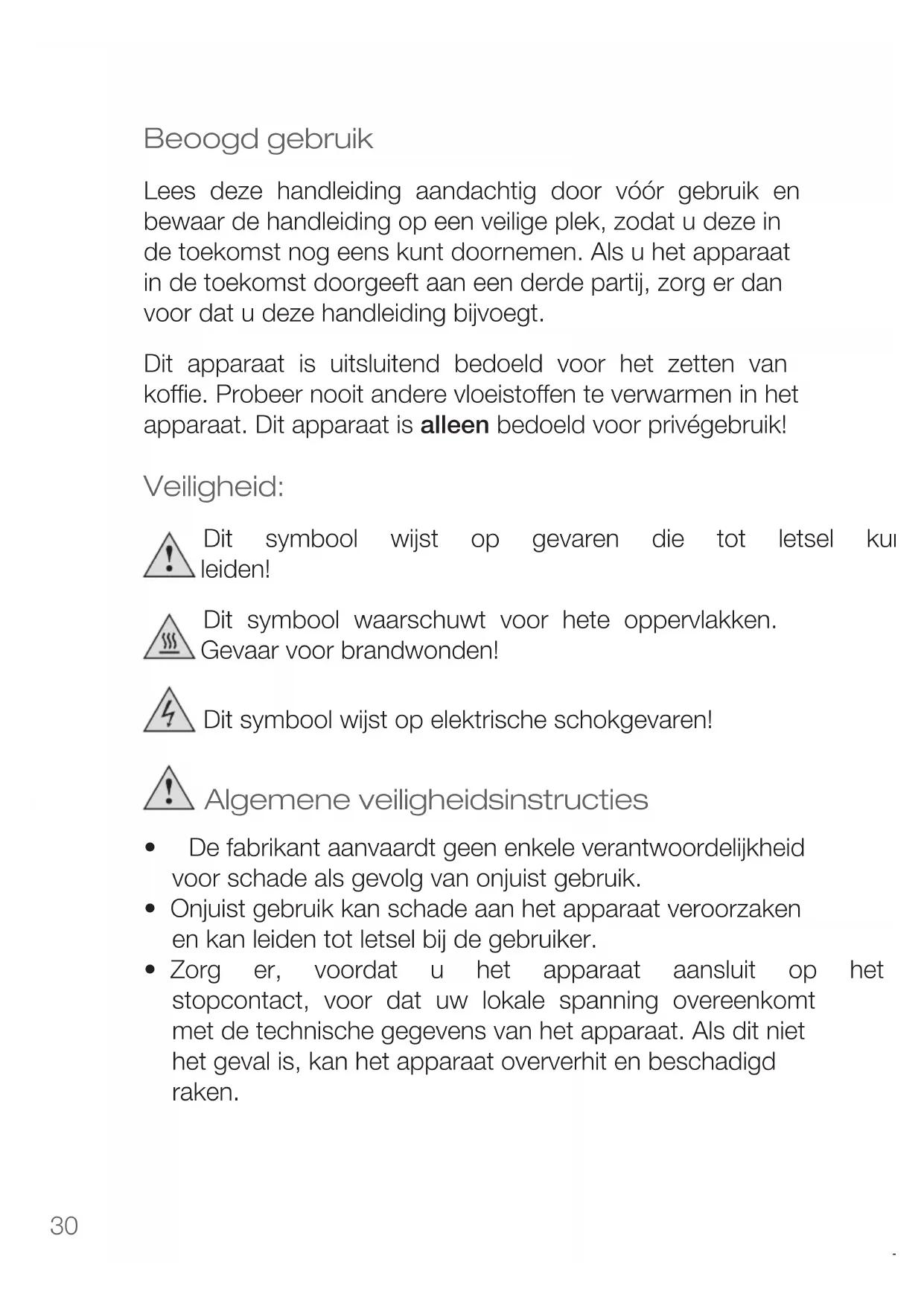 - fordamagescausedbyowner This guarantee does not affect your statutory right, nor any legal right you may have as a costumer under applicable national legislation governing the purchase of goods. Inordertoasserthis/herrightinaguaranteecaseduringthe guaranteed period, the customer must provide evidence of the date of purchase (receipt). The guarantee is to be asserted against KORONA electric GmbH, Sundern/Germany. Service Address: KORONA Service, Am Steinbach 9, 59872 Meschede, Germany Telephone Hotline: 02933 90284-80 Mail: service@korona-electric.de web: www.korona-electric.de within 2 years after the date of purchase. In case of guarantee the customer is given the right to get the appliance repaired at our own or at an authorized shop. Further rights (due to guarantee case) are not given to the customer.30 Beoogd gebruik Lees deze handleiding aandachtig door vóór gebruik en bewaar de handleiding op een veilige plek, zodat u deze in de toekomst nog eens kunt doornemen. Als u het apparaat indetoekomstdoorgeeftaaneenderdepartij,zorgerdan voordatudezehandleidingbijvoegt. Dit apparaat is uitsluitend bedoeld voor het zetten van koffie. Probeer nooit andere vloeistoffen te verwarmen in het apparaat. Dit apparaat is alleen bedoeld voor privégebruik! Veiligheid: Dit symbool wijst op gevaren die tot letsel kunnen leiden! Dit symbool waarschuwt voor hete oppervlakken. Gevaar voor brandwonden! Ditsymboolwijstopelektrischeschokgevaren! Algemene veiligheidsinstructies