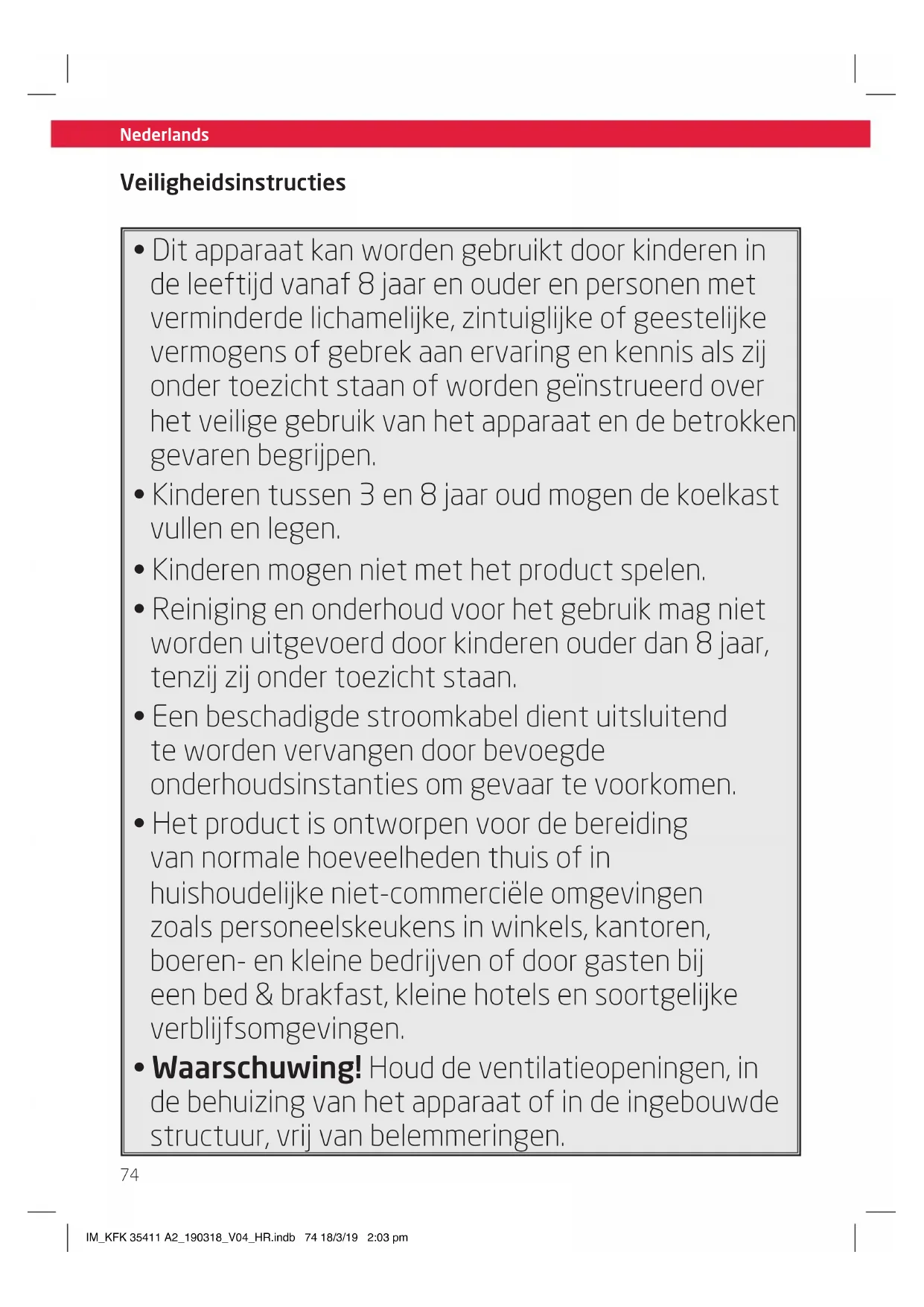 - Waarschuwing! Houd de ventilatieopeningen, in de behuizing van het apparaat of in de ingebouwde structuur, vrij van belemmeringen. IM_KFK 35411 A2_190318_V04_HR.indb 74 18/3/19 2:03 pmNederlands