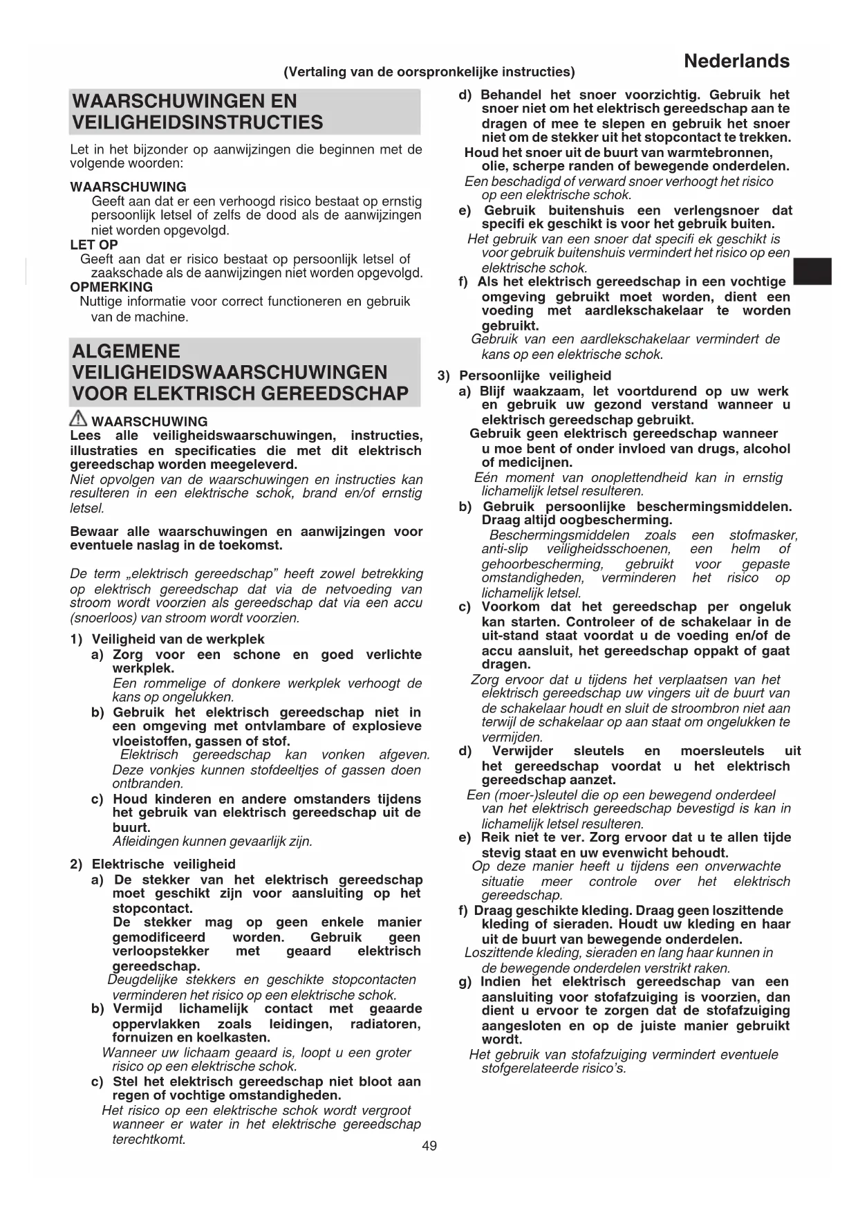 a) Blijf waakzaam, let voortdurend op uw werk en gebruik uw gezond verstand wanneer u elektrisch gereedschap gebruikt. Gebruik geen elektrisch gereedschap wanneer u moe bent of onder invloed van drugs, alcohol of medicijnen. Eén moment van onoplettendheid kan in ernstig lichamelijk letsel resulteren. b) Gebruik persoonlijke beschermingsmiddelen. Draag altijd oogbescherming. Beschermingsmiddelen zoals een stofmasker, anti-slip veiligheidsschoenen, een helm of gehoorbescherming, gebruikt voor gepaste omstandigheden, verminderen het risico op lichamelijk letsel. c) Voorkom dat het gereedschap per ongeluk kan starten. Controleer of de schakelaar in de uit-stand staat voordat u de voeding en/of de accu aansluit, het gereedschap oppakt of gaat dragen. Zorg ervoor dat u tijdens het verplaatsen van het elektrisch gereedschap uw vingers uit de buurt van de schakelaar houdt en sluit de stroombron niet aan terwijl de schakelaar op aan staat om ongelukken te vermijden. d) Verwijder sleutels en moersleutels uit het gereedschap voordat u het elektrisch gereedschap aanzet. Een (moer-)sleutel die op een bewegend onderdeel van het elektrisch gereedschap bevestigd is kan in lichamelijk letsel resulteren. e) Reik niet te ver. Zorg ervoor dat u te allen tijde stevig staat en uw evenwicht behoudt. Op deze manier heeft u tijdens een onverwachte situatie meer controle over het elektrisch gereedschap. f) Draag geschikte kleding. Draag geen loszittende kleding of sieraden. Houdt uw kleding en haar uit de buurt van bewegende onderdelen. Loszittende kleding, sieraden en lang haar kunnen in de bewegende onderdelen verstrikt raken. g) Indien het elektrisch gereedschap van een aansluiting voor stofafzuiging is voorzien, dan dient u ervoor te zorgen dat de stofafzuiging aangesloten en op de juiste manier gebruikt wordt. Het gebruik van stofafzuiging vermindert eventuele stofgerelateerde risico’s. WAARSCHUWINGEN EN VEILIGHEIDSINSTRUCTIES Let in het bijzonder op aanwijzingen die beginnen met de volgende woorden: WAARSCHUWING Geeft aan dat er een verhoogd risico bestaat op ernstig persoonlijk letsel of zelfs de dood als de aanwijzingen niet worden opgevolgd. LET OP Geeft aan dat er risico bestaat op persoonlijk letsel of zaakschade als de aanwijzingen niet worden opgevolgd. OPMERKING Nuttige informatie voor correct functioneren en gebruik van de machine. ALGEMENE VEILIGHEIDSWAARSCHUWINGEN