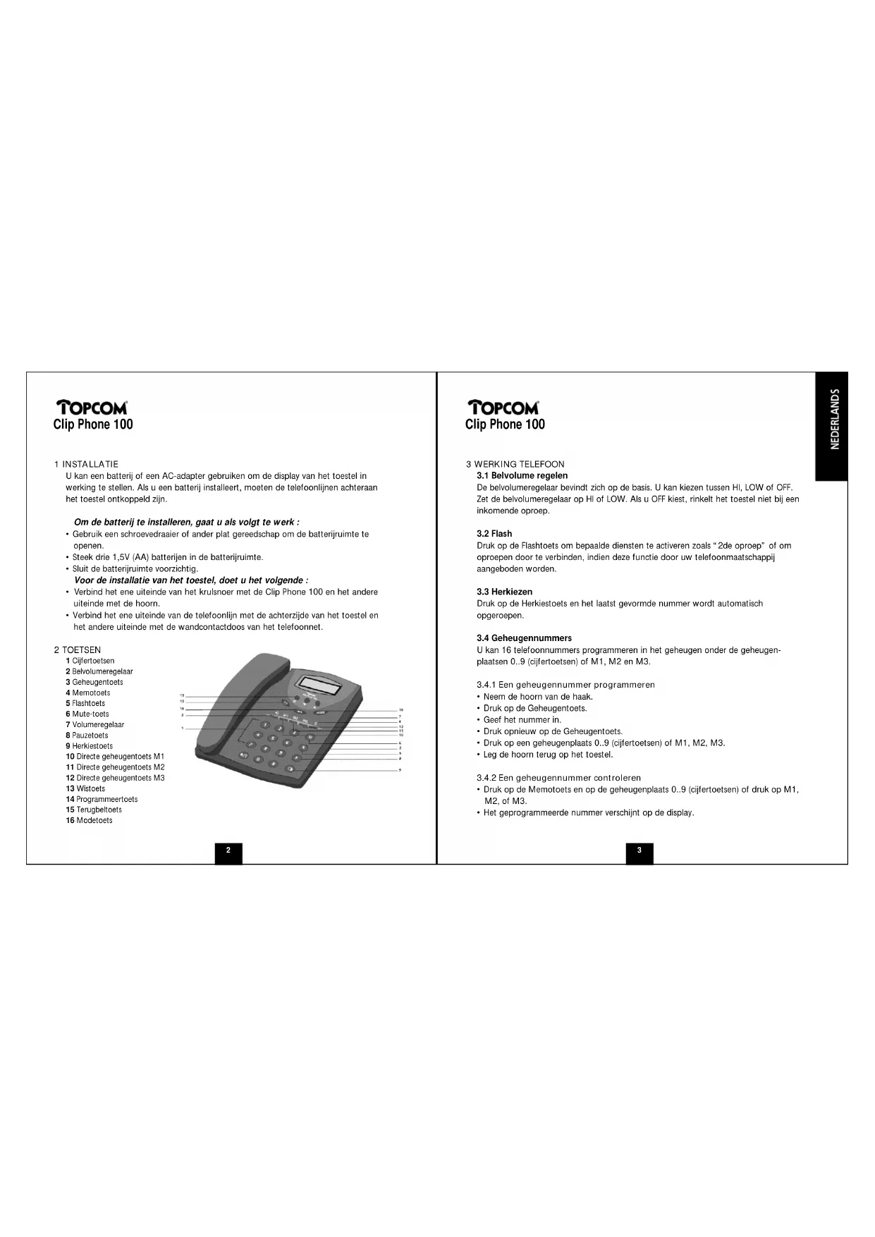 - Verbind het ene uiteinde van de telefoonlijn met de achterzijde van het toestel en het andere uiteinde met de wandcontactdoos van het telefoonnet. 2 TOETSEN 1 Cijfertoetsen 2 Belvolumeregelaar 3 Geheugentoets 4 Memotoets 5 Flashtoets 6 Mute-toets 7 Volumeregelaar 8 Pauzetoets 9 Herkiestoets 10 Directe geheugentoets M1 11 Directe geheugentoets M2 12 Directe geheugentoets M3 13 Wistoets 14 Programmeertoets 15 Terugbeltoets 16 Modetoets