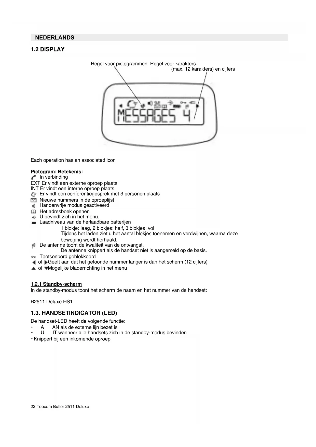 y-scherm In de standby-modus toont het scherm de naam en het nummer van de handset: B2511 Deluxe HS1 1.3. HANDSETINDICATOR (LED) De handset-LED heeft de volgende functie: