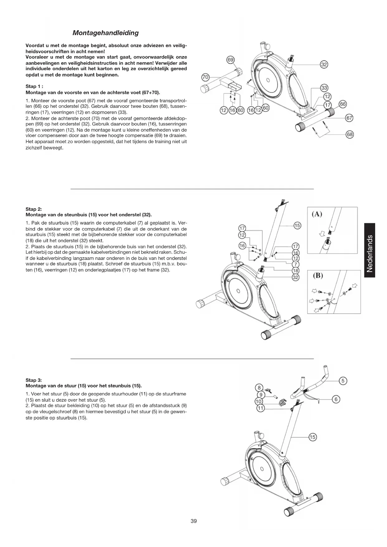 pen (69) op het onderstel (32). Gebruik daarvoor bouten (16), tussenringen (60) en veerringen (12). Na de montage kunt u kleine oneffenheden van de vloer compenseren door aan de twee hoogte compensatie (69) te draaien. Het apparaat moet zo worden opgesteld, dat het tijdens de training niet uit zichzelf beweegt. Stap 2: Montage van de steunbuis (15) voor het onderstel (32).