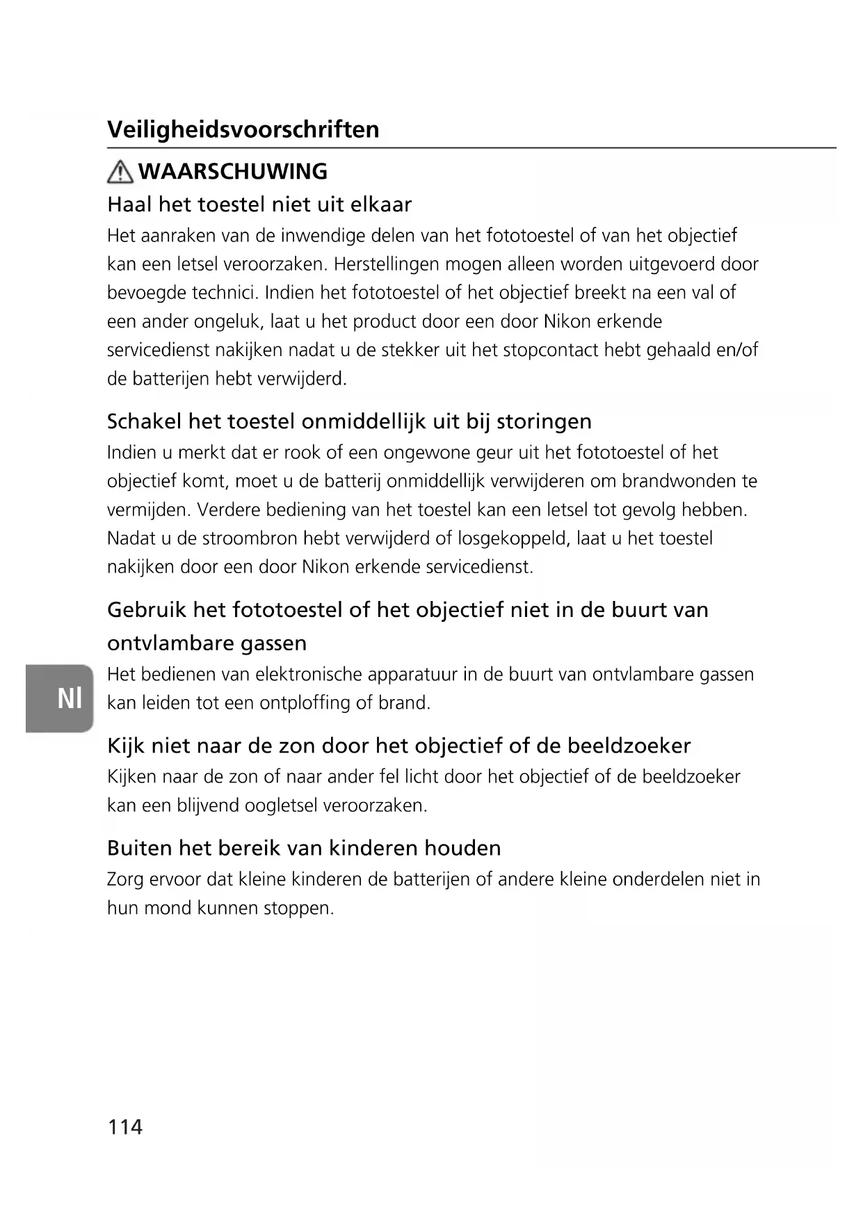 Haal het toestel niet uit elkaar Het aanraken van de inwendige delen van het fototoestel of van het objectief kan een letsel veroorzaken. Herstellingen mogen alleen worden uitgevoerd door bevoegde technici. Indien het fototoestel of het objectief breekt na een val of een ander ongeluk, laat u het product door een door Nikon erkende servicedienst nakijken nadat u de stekker uit het stopcontact hebt gehaald en/of de batterijen hebt verwijderd. Schakel het toestel onmiddellijk uit bij storingen Indien u merkt dat er rook of een ongewone geur uit het fototoestel of het objectief komt, moet u de batterij onmiddellijk verwijderen om brandwonden te vermijden. Verdere bediening van het toestel kan een letsel tot gevolg hebben. Nadat u de stroombron hebt verwijderd of losgekoppeld, laat u het toestel nakijken door een door Nikon erkende servicedienst. Gebruik het fototoestel of het objectief niet in de buurt van ontvlambare gassen Het bedienen van elektronische apparatuur in de buurt van ontvlambare gassen kan leiden tot een ontploffing of brand. Kijk niet naar de zon door het objectief of de beeldzoeker Kijken naar de zon of naar ander fel licht door het objectief of de beeldzoeker kan een blijvend oogletsel veroorzaken. Buiten het bereik van kinderen houden Zorg ervoor dat kleine kinderen de batterijen of andere kleine onderdelen niet in hun mond kunnen stoppen. Veiligheidsvoorschriften WAARSCHUWING115
